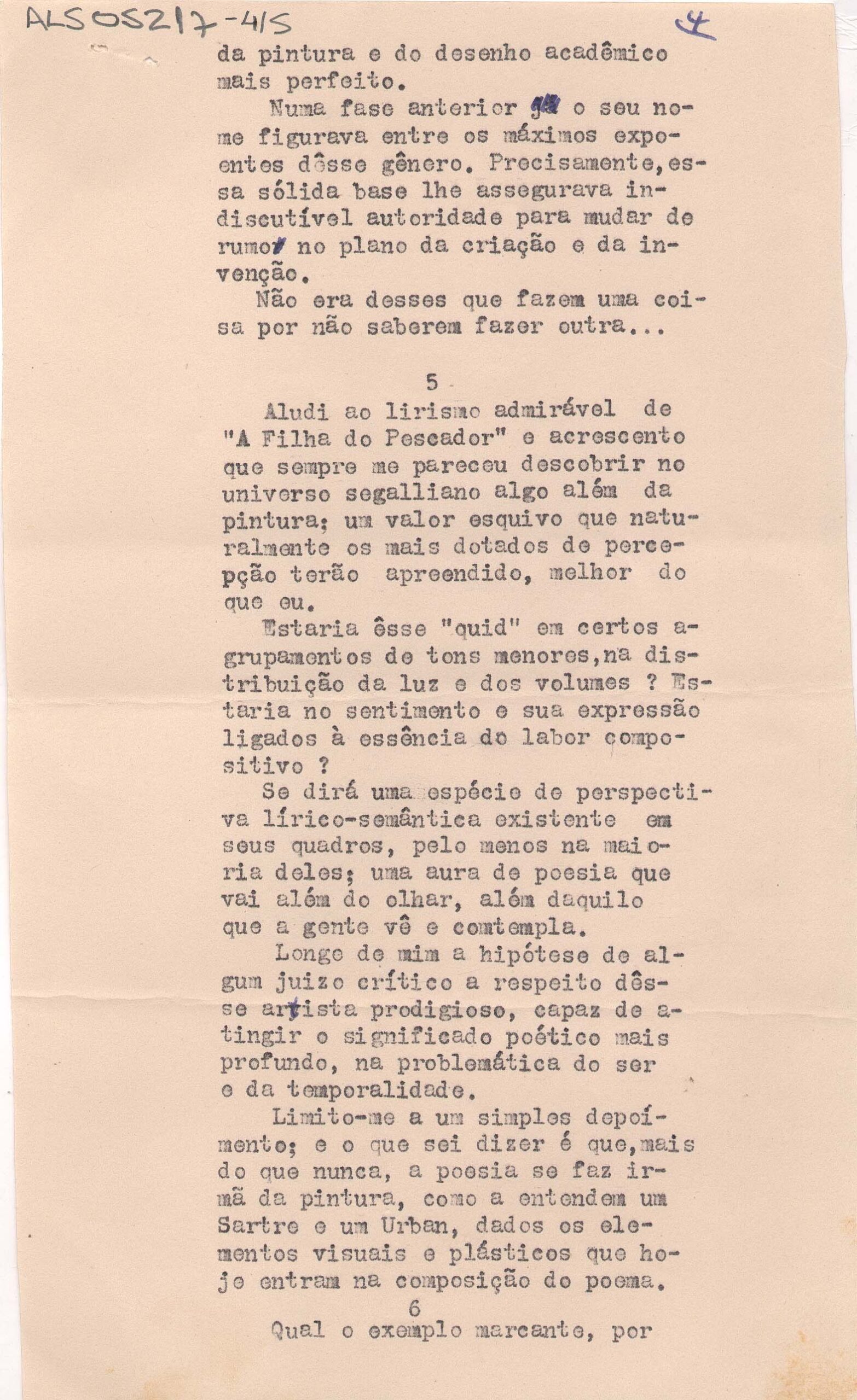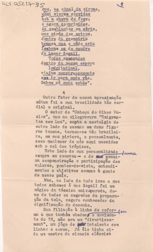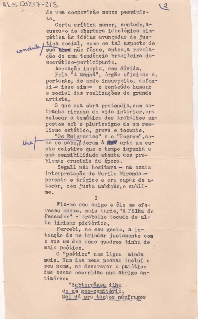 ALS Pasta: (Fotos - D. Jenny. Escultura. Depoimentos (anos 60)). Envelope interno: originais de alguns depoimentos sobre Lasar Segall feitos por alguns intelectuais em 1967 após a morte de Jenny. K. Segall; a pedido de Murilo Miranda para Revista Acedêmica. [letra Vera d'Horta]