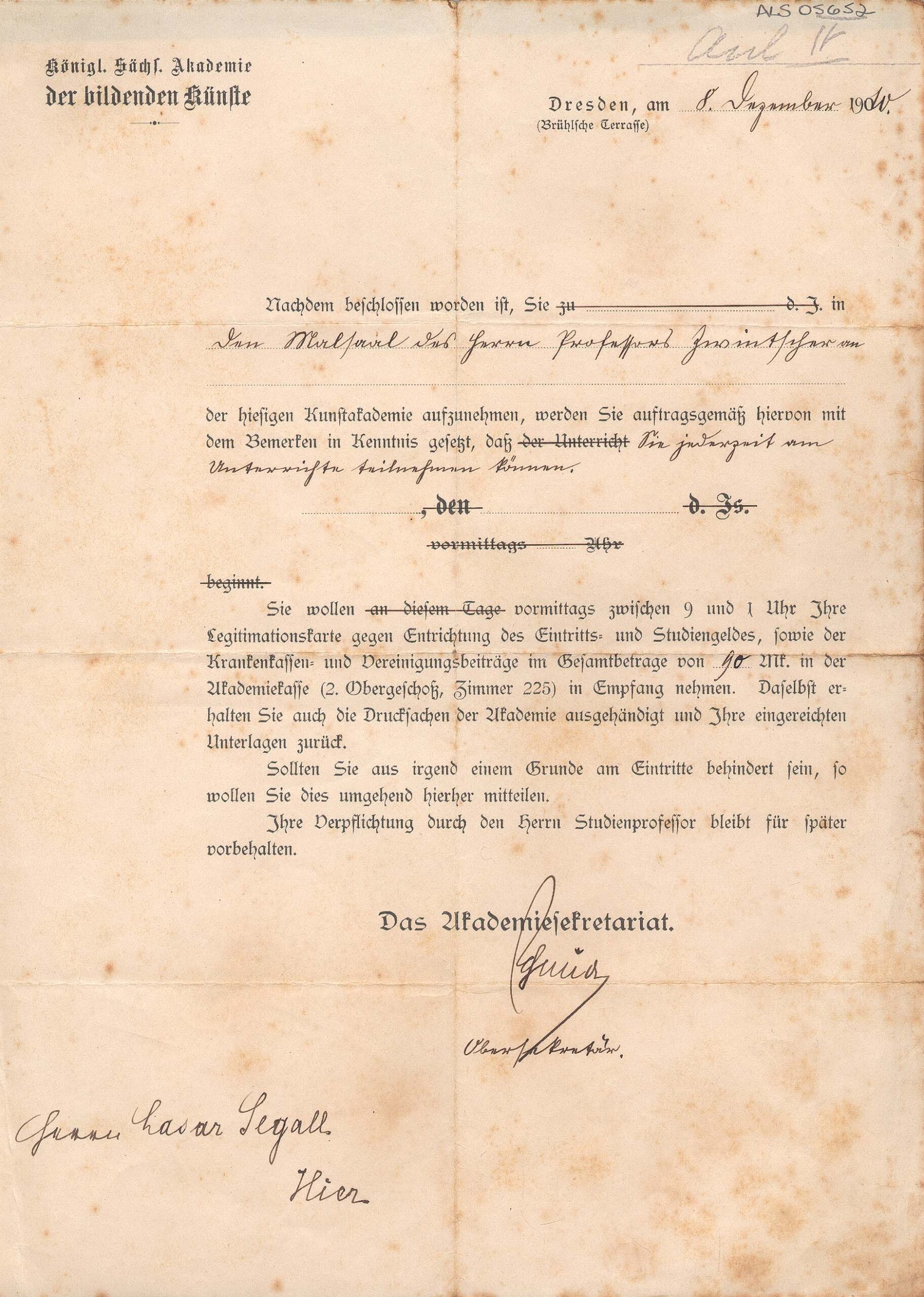 Documento que atesta a qualificação de Lasar Segall para estudar na Academia de Belas Artes de Dresden