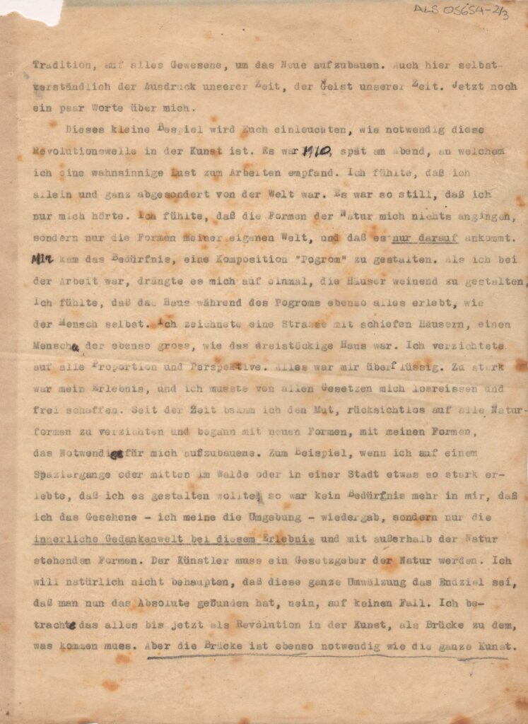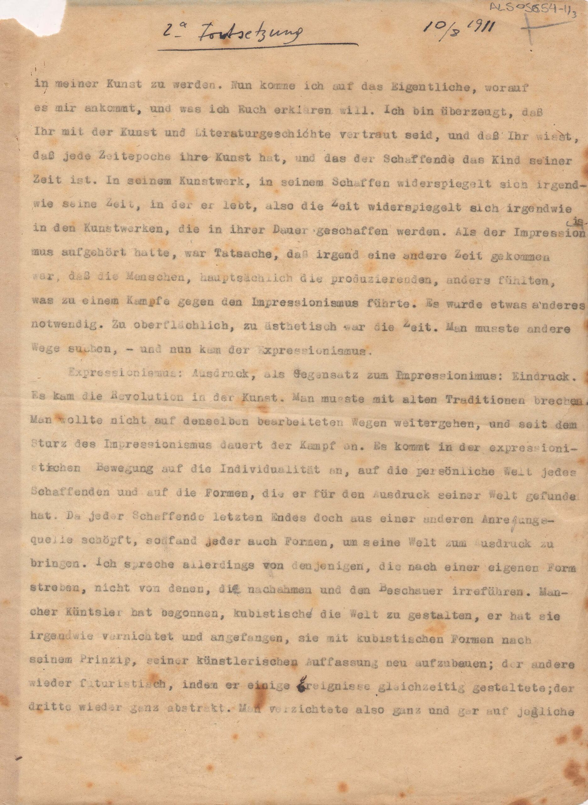 2a. Fortsetzung / "2ª continuação": o texto começa no meio de uma frase; cópia xerox: Reserva Técnica, Armário de aço, Gaveta 1, Pasta 1911-1920; entre as diversas anotações manuscritas a tinta preta ao longo do documento, há uma rasura feita sobre a data em que o pintor declara o início de seus impulsos expressionistas, na página 2; a observação do documento indica que a data datiloscrita sob esta anotação é 1914; há ainda uma mutilação na porção inferior da página 3, que parece ter sido cortada