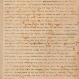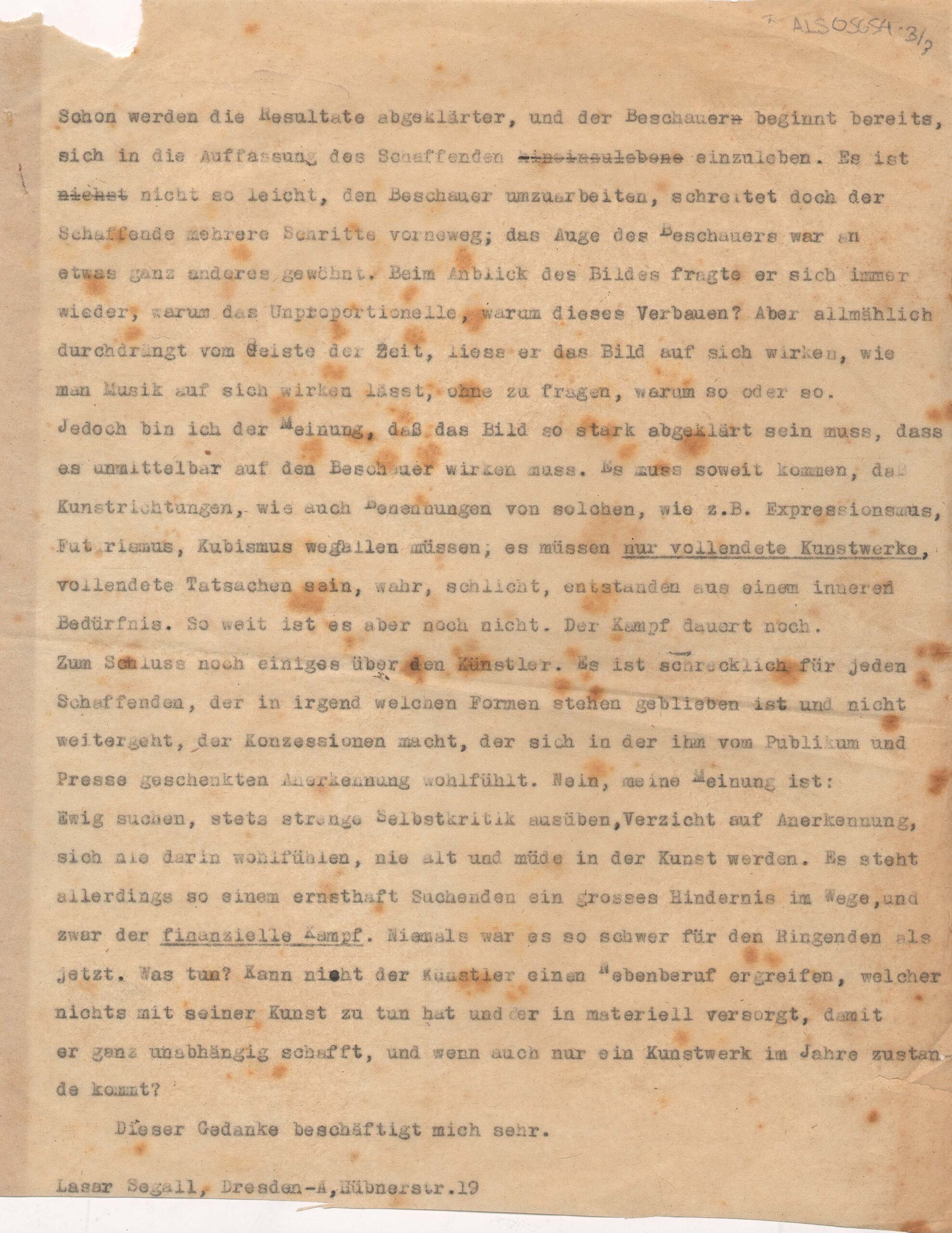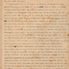 2a. Fortsetzung / "2ª continuação": o texto começa no meio de uma frase; cópia xerox: Reserva Técnica, Armário de aço, Gaveta 1, Pasta 1911-1920; entre as diversas anotações manuscritas a tinta preta ao longo do documento, há uma rasura feita sobre a data em que o pintor declara o início de seus impulsos expressionistas, na página 2; a observação do documento indica que a data datiloscrita sob esta anotação é 1914; há ainda uma mutilação na porção inferior da página 3, que parece ter sido cortada