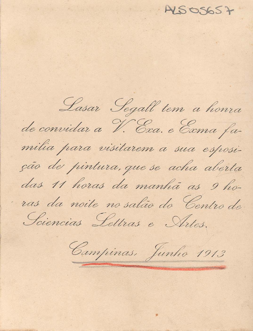 Lasar Segall tem a honra de convidar / Grifos em lápis vermelho e grafite, sublinhando local e data