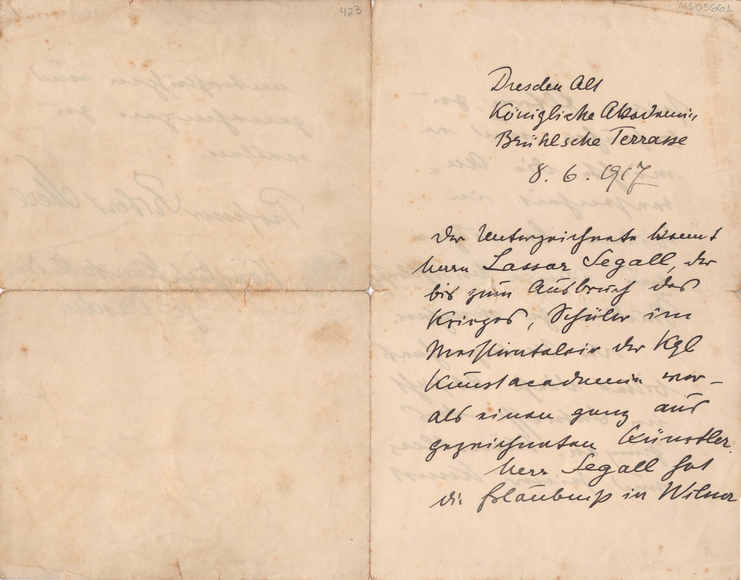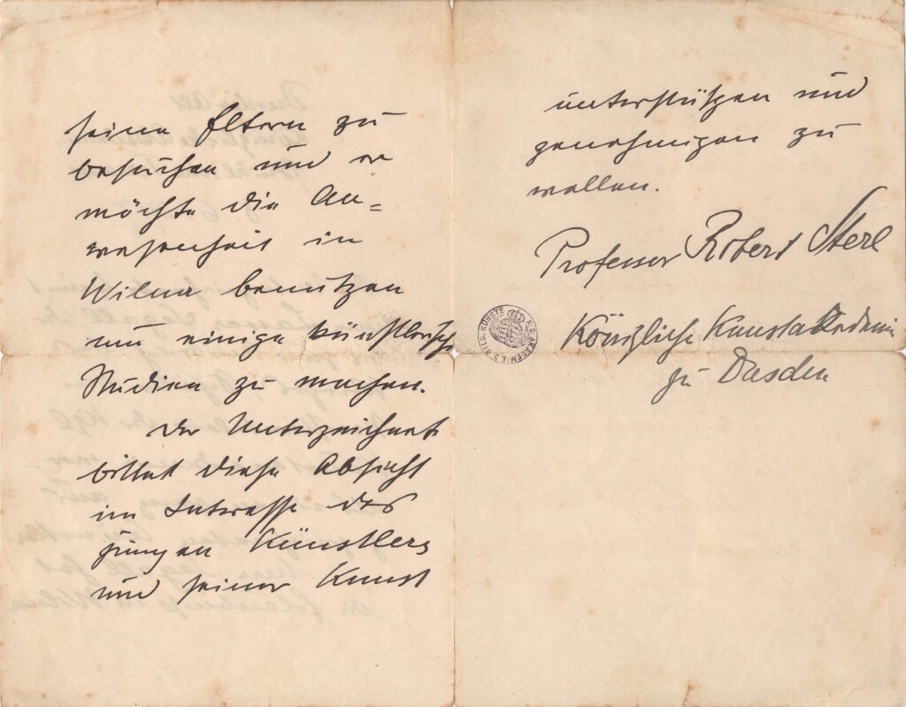 Carta do professor Robert Sterl atestando a qualidade de Lasar Segall como aluno-mestre da Academia de Dresden, e pedindo licença para que ele viajasse a Vilna, para visitar os parentes e estudar