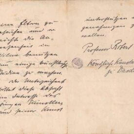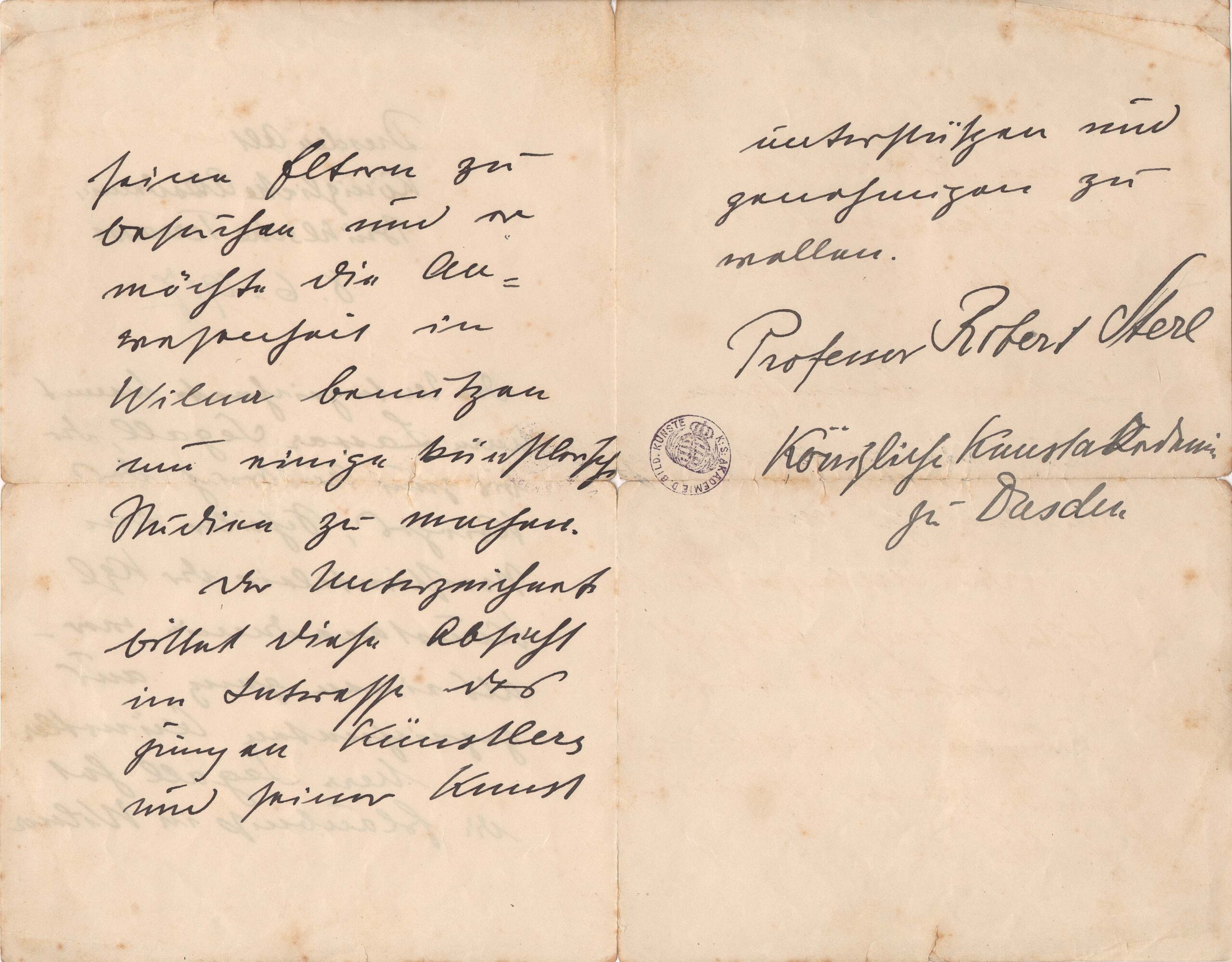 Carta do professor Robert Sterl atestando a qualidade de Lasar Segall como aluno-mestre da Academia de Dresden, e pedindo licença para que ele viajasse a Vilna, para visitar os parentes e estudar