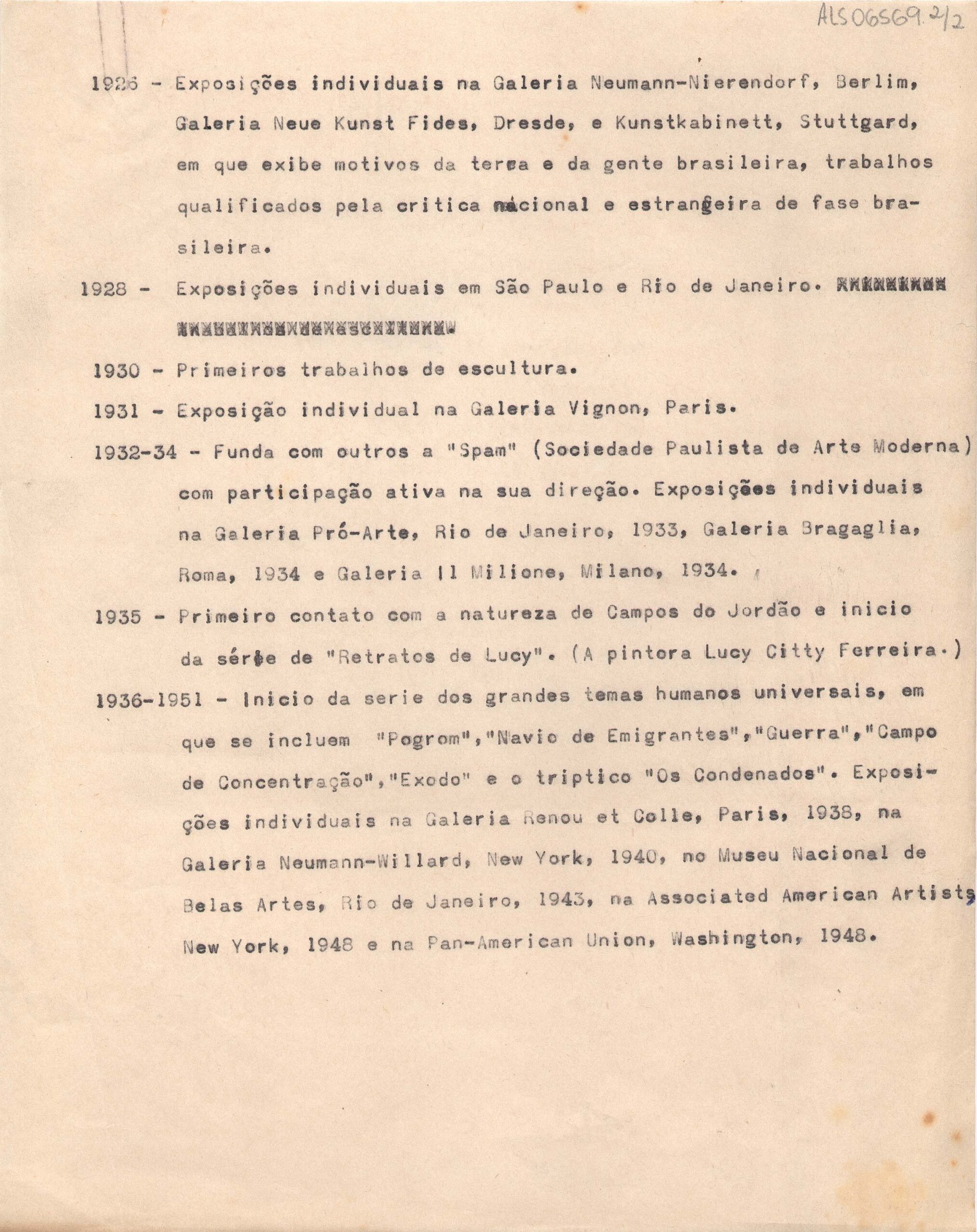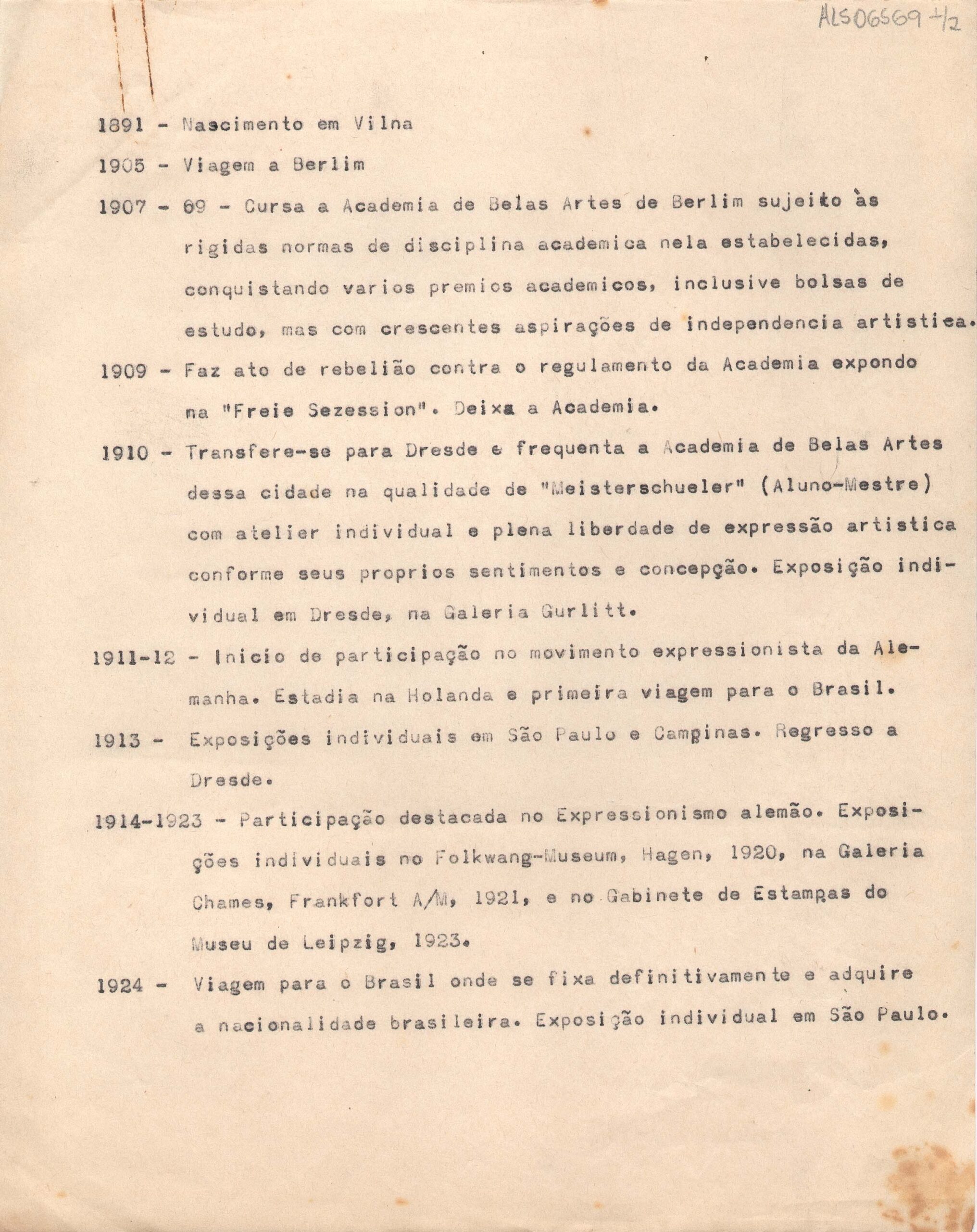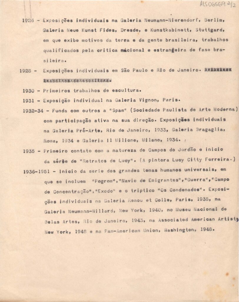 Biografia resumida de Lasar Segall provavelmente para o catálogo da retrospectiva no Museu de Arte de São Paulo, em 1951