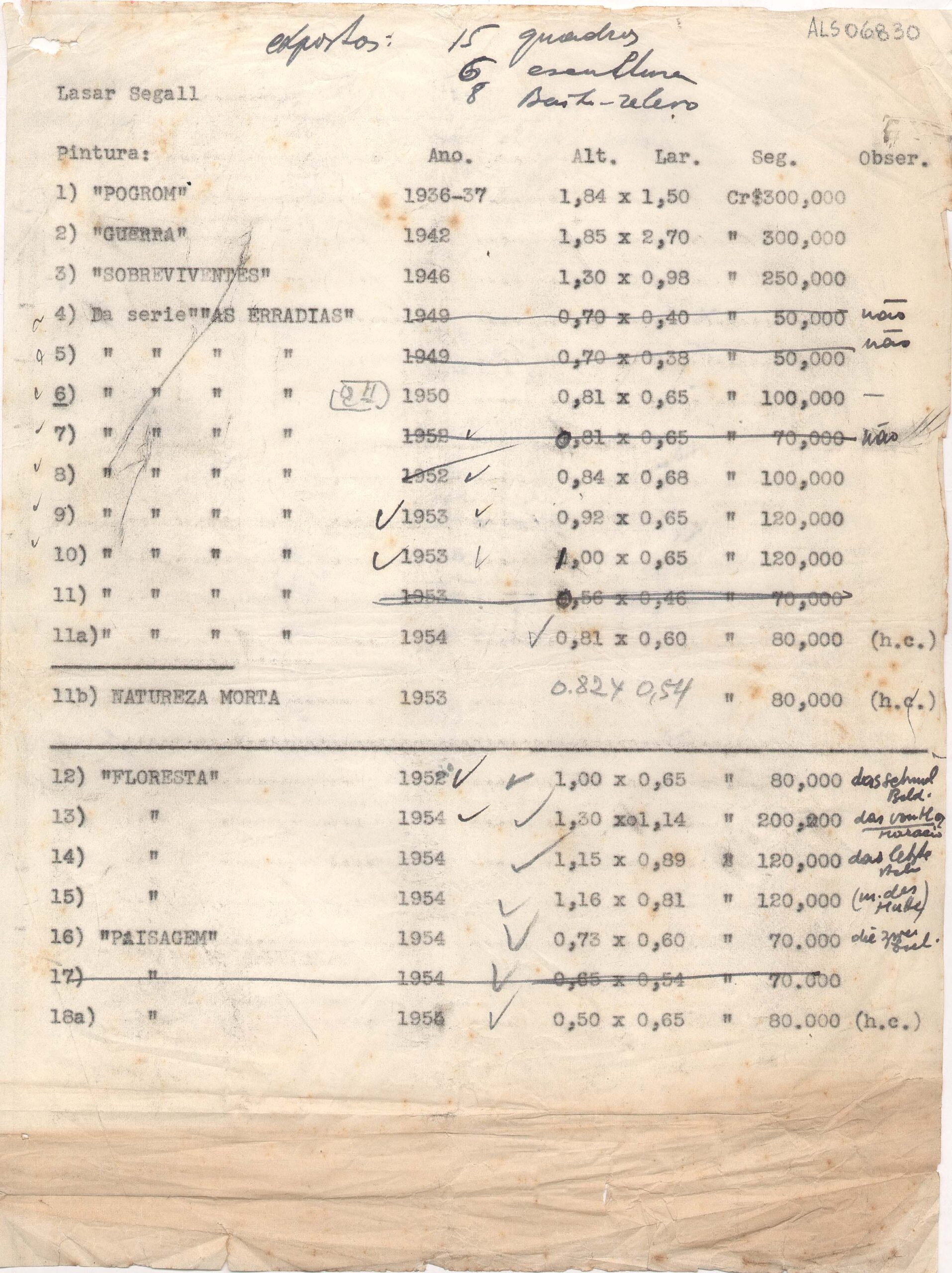 Lista de pinturas de Lasar Segall provavelmente a serem expostas na III Bienal do Museu de Arte Moderna de São Paulo