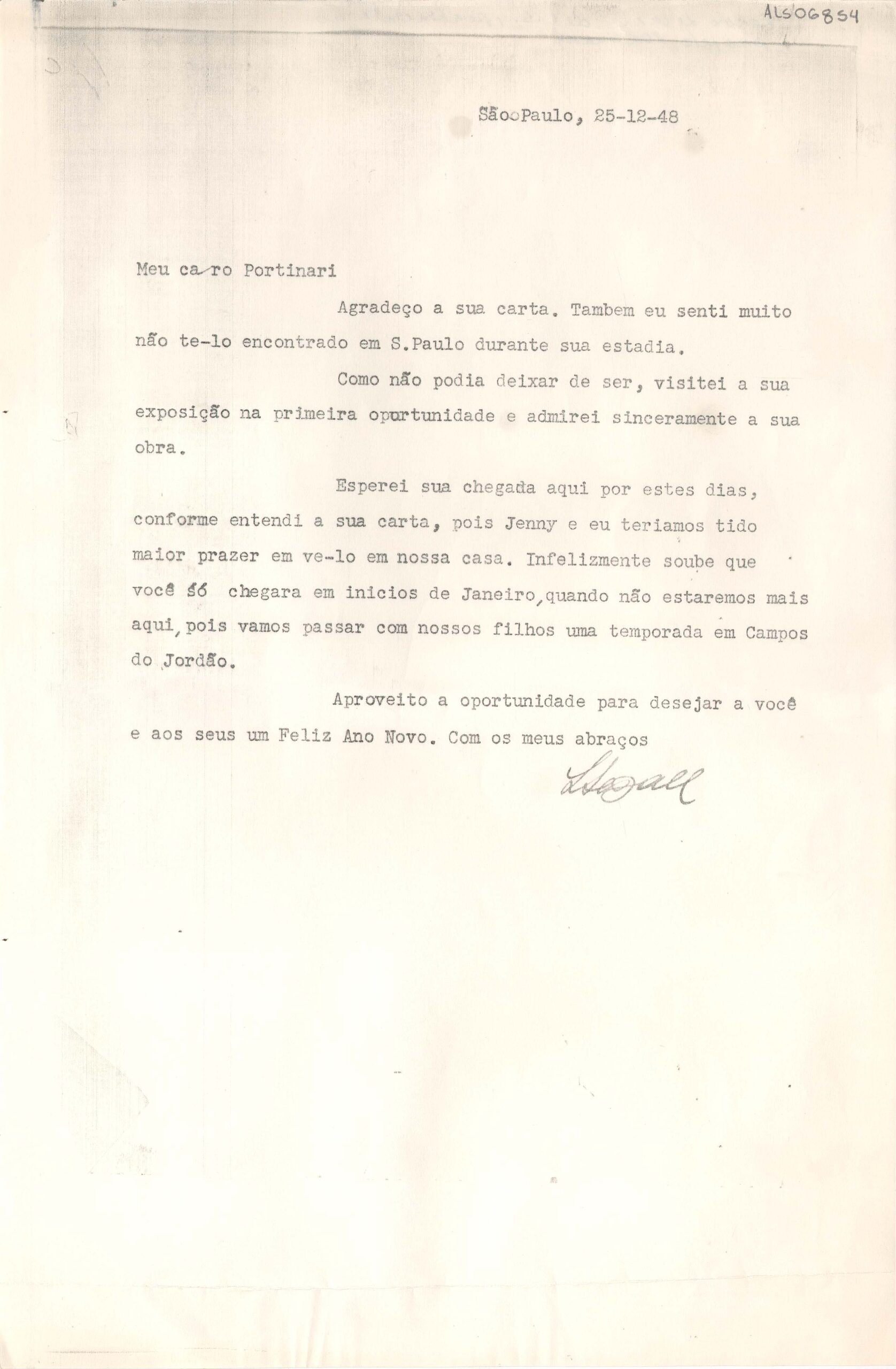 Agradece a carta recebida e lamenta não terem se encontrado em São Paulo; diz que visitou a exposição de Portinari e admirou sinceramente a sua obra; vai passar uma temporada em Campos do Jordão; deseja um Feliz Ano Novo