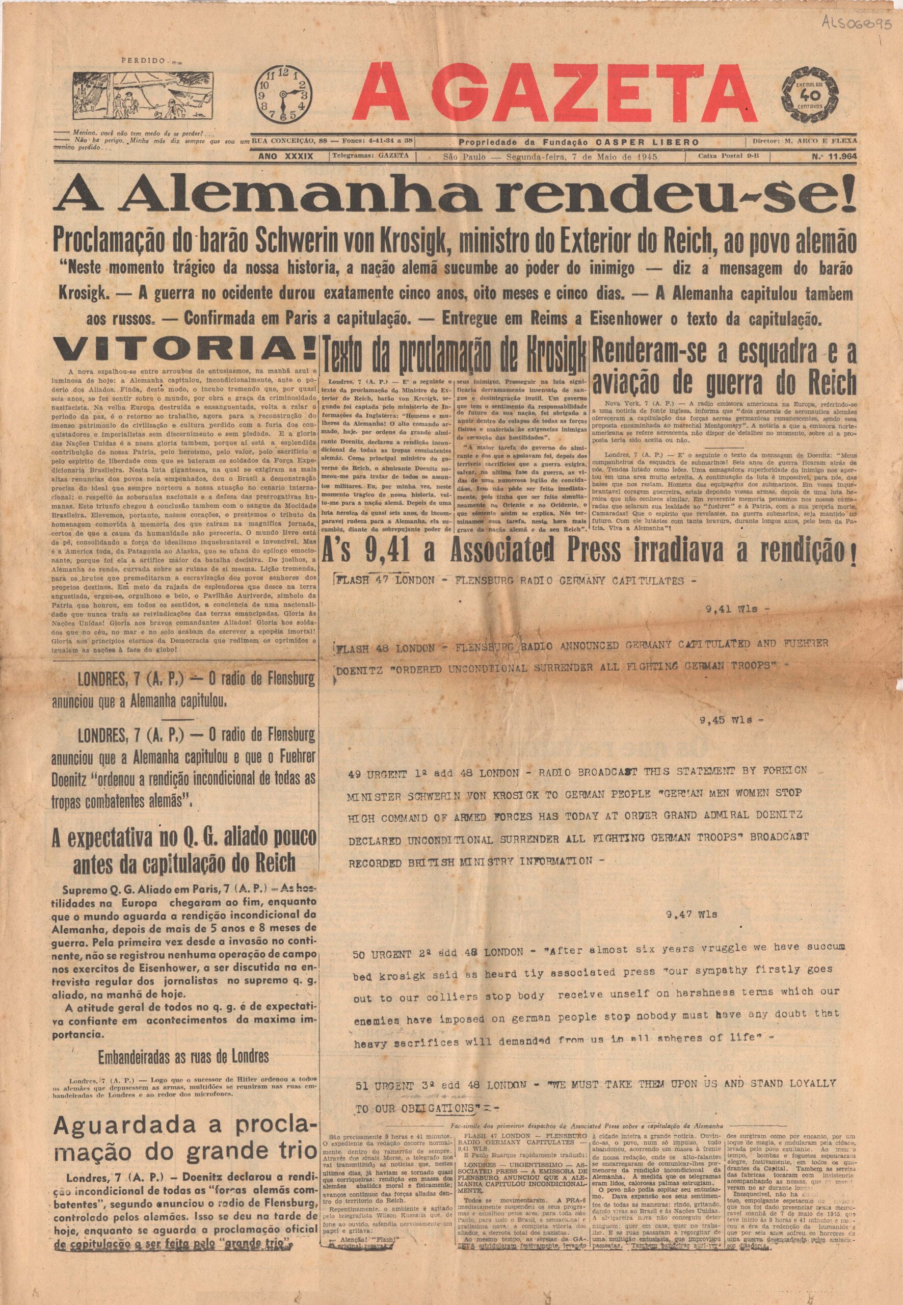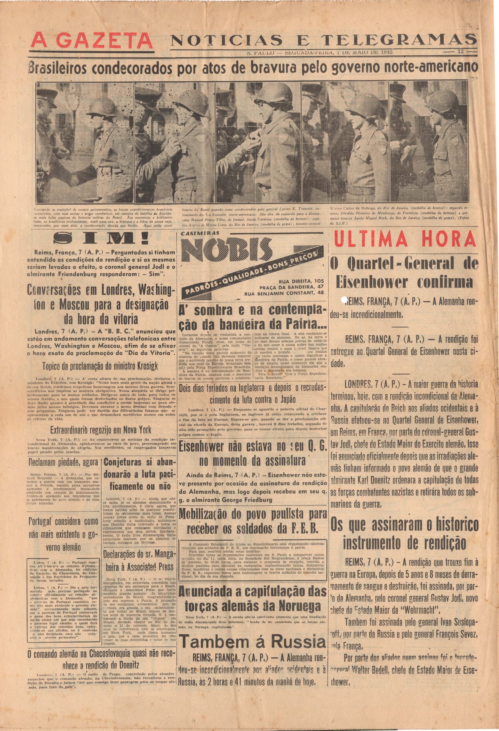 Notícias sobre o fim da 2ª Guerra Mundial com a rendição da Alemanha