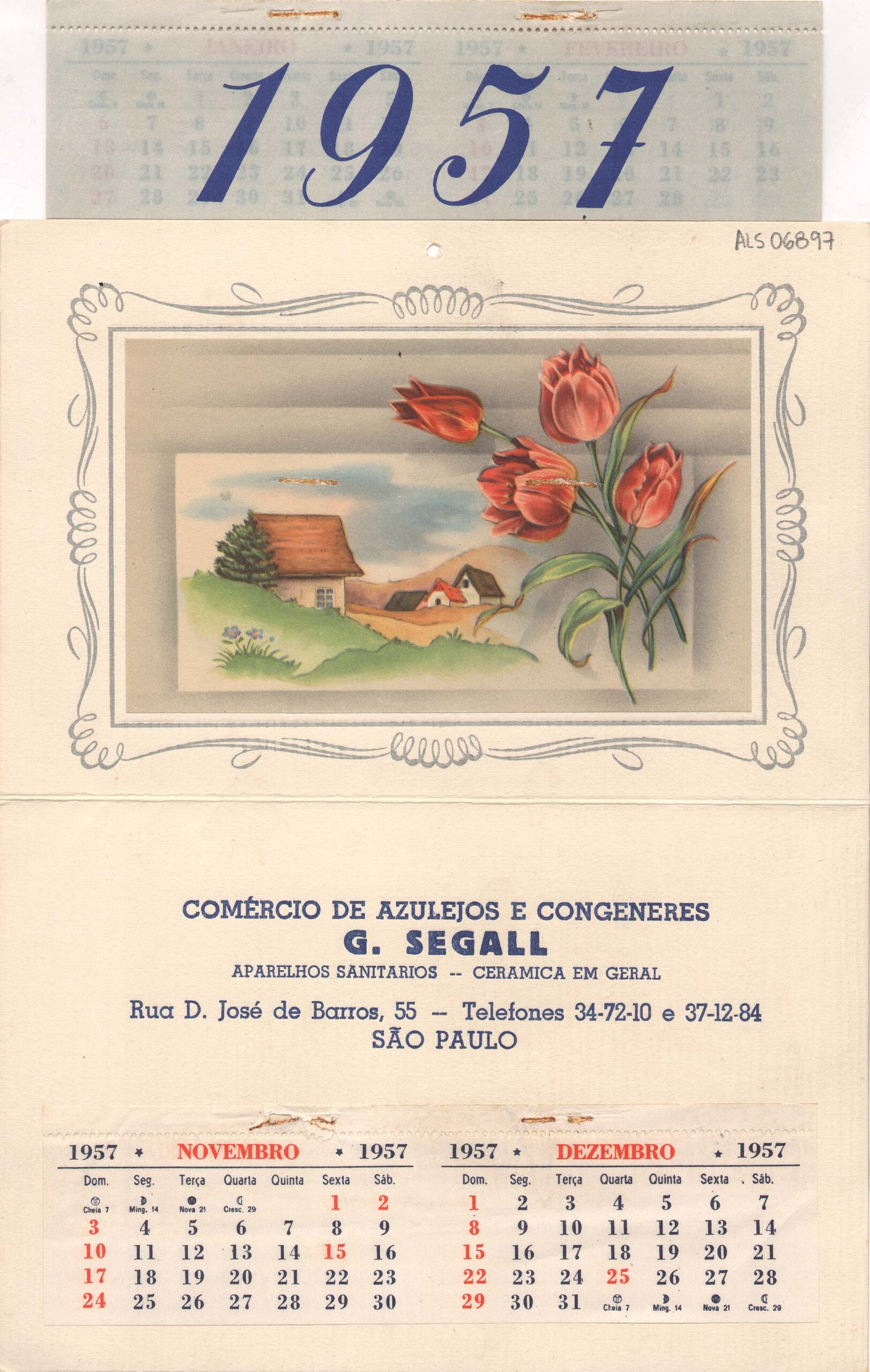 Pag.01: imagem de paisagem colorida impressa; calendário de 1957 com meses em folhinhas; algumas folhas estão soltas