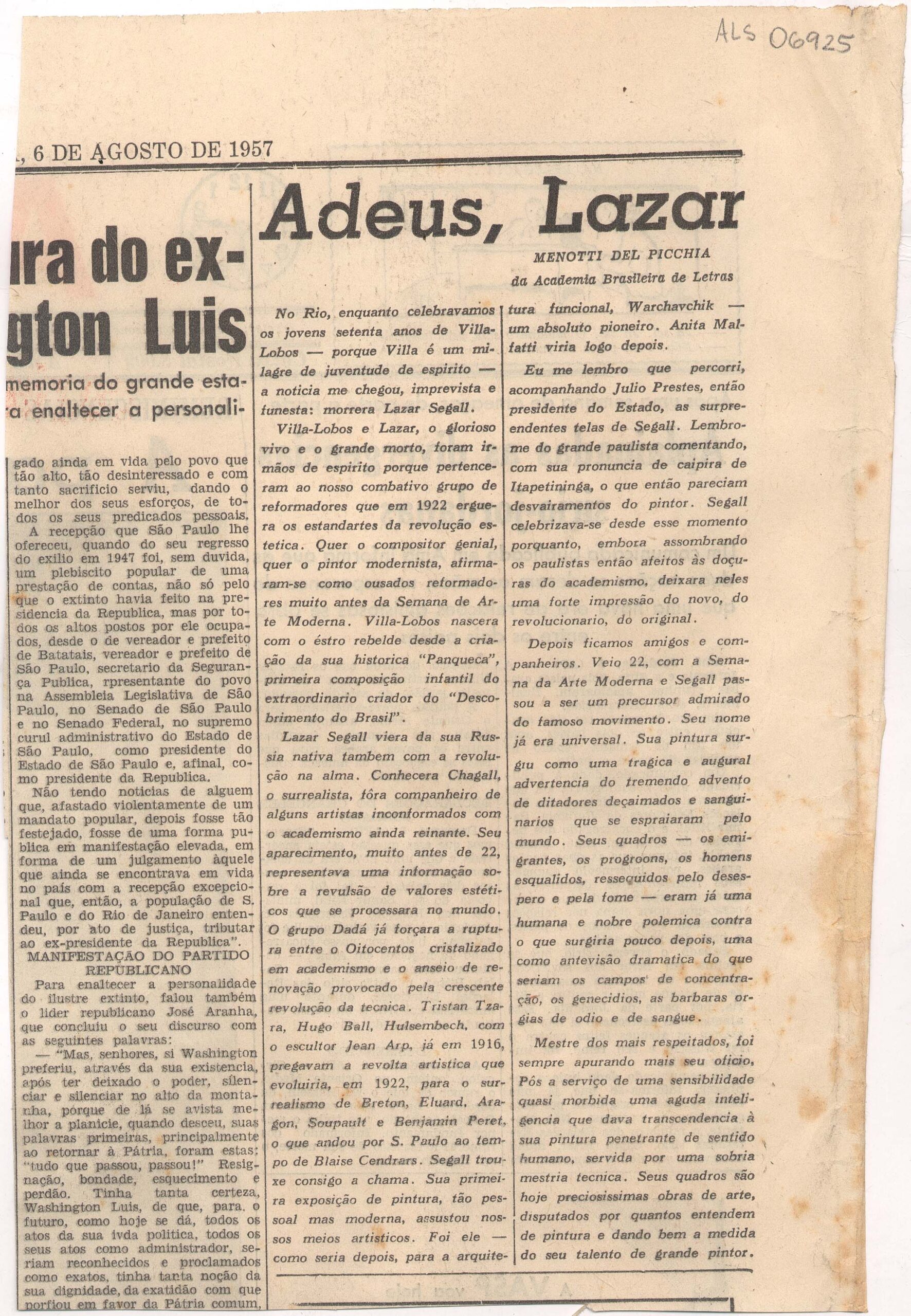 ALS Pasta: (Artigos sobre a morte de Lasar Segall encontrados no Arquivo de Mauricio Segall - 1957-58). (Transferência do Arquivo de Mauricio para o ALS; 1998) [letra Vera dHorta]