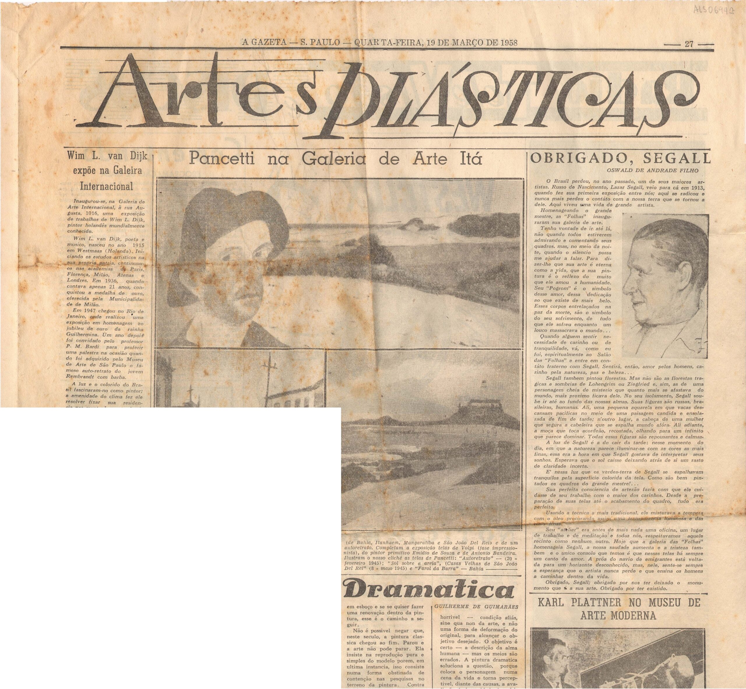 Crônica publicada no jornal A Gazeta a respeito da inauguração da Galeria de Arte das Folhas com exposição retrospectiva de Lasar Segall
