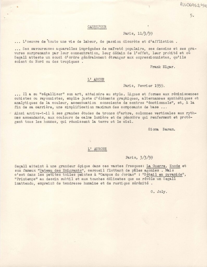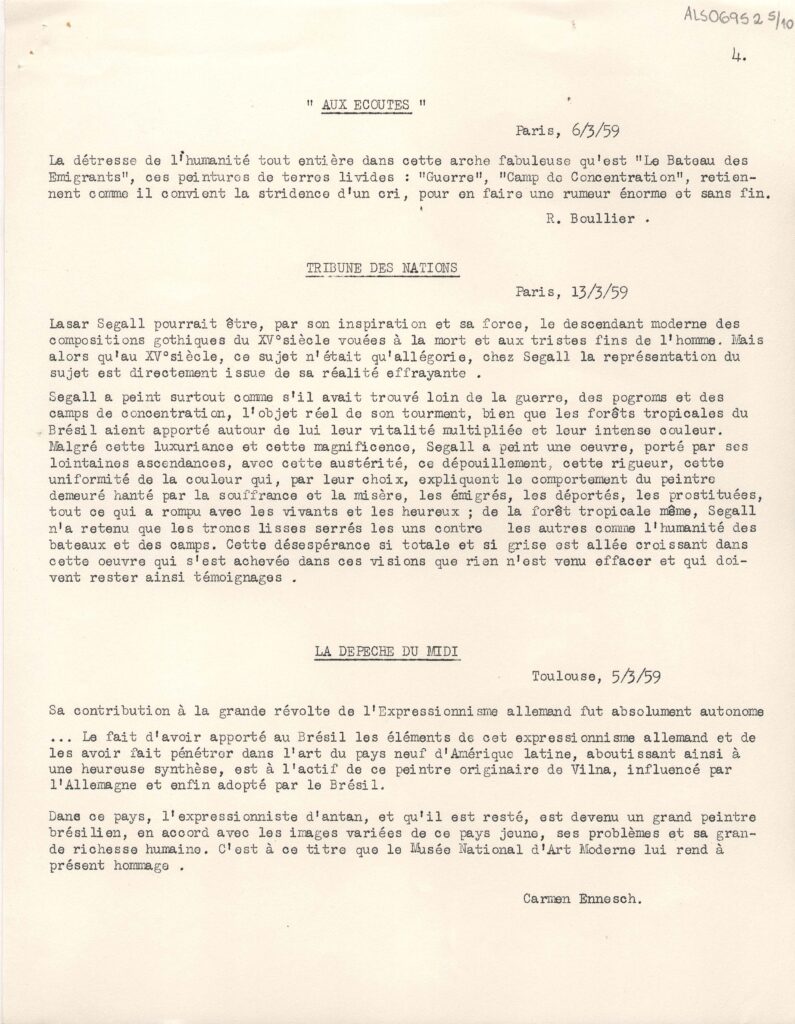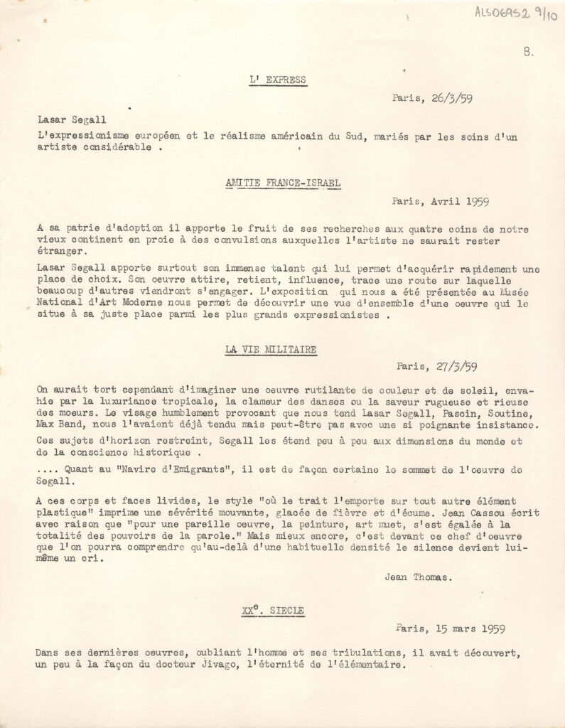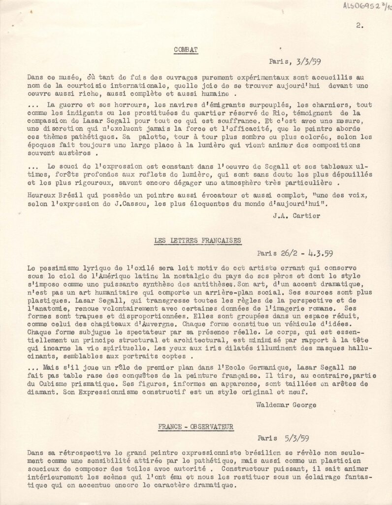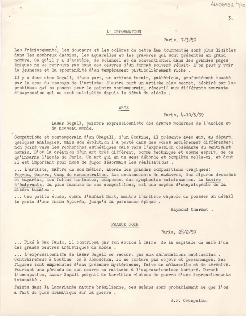 Excertos de textos críticos extraídos de diversas publicações da Europa, a respeito da exposição retrospectiva póstuma de Lasar Segall no Musée National d'Art Moderne Paris