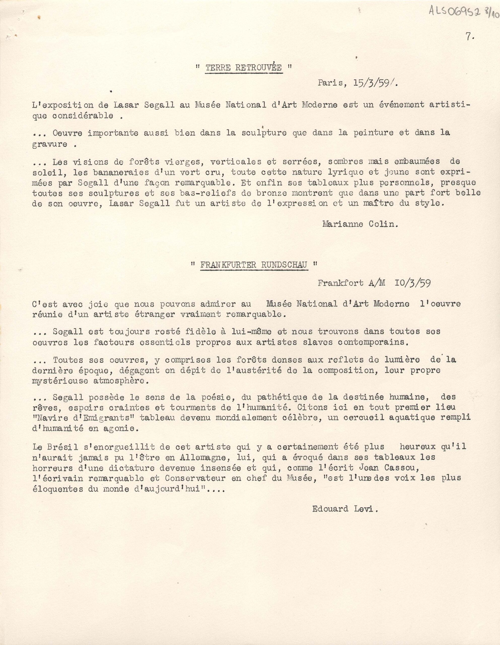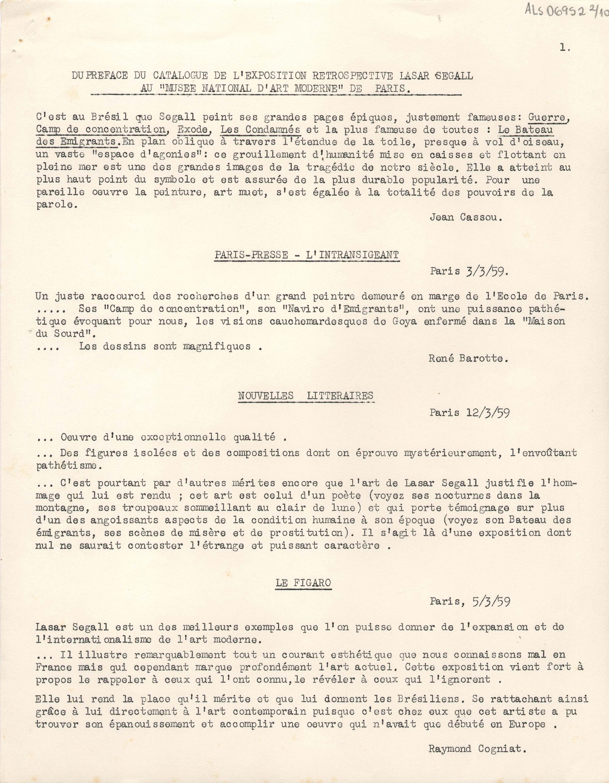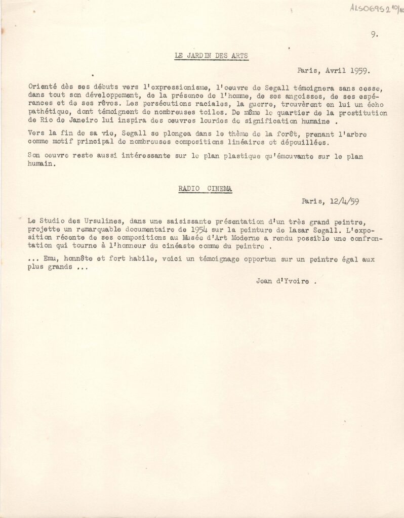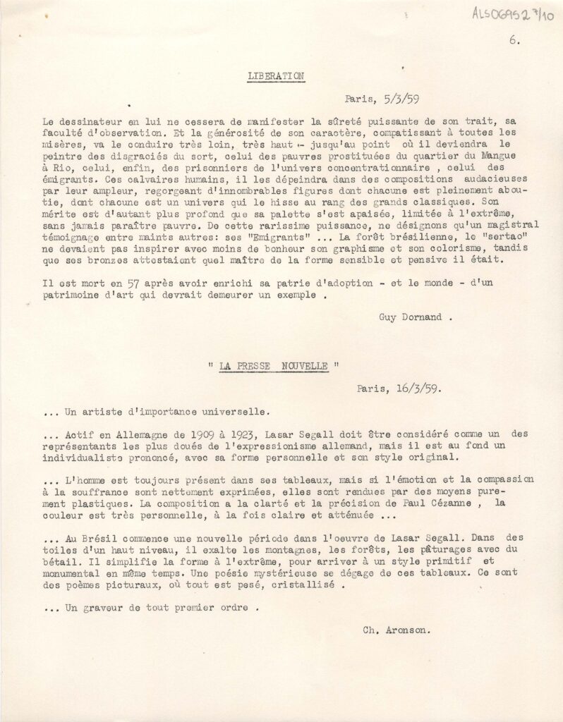 Excertos de textos críticos extraídos de diversas publicações da Europa, a respeito da exposição retrospectiva póstuma de Lasar Segall no Musée National d'Art Moderne Paris