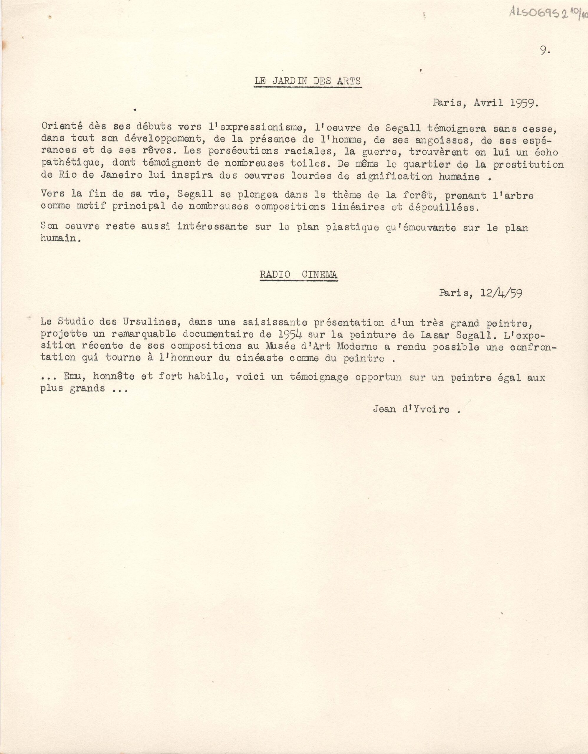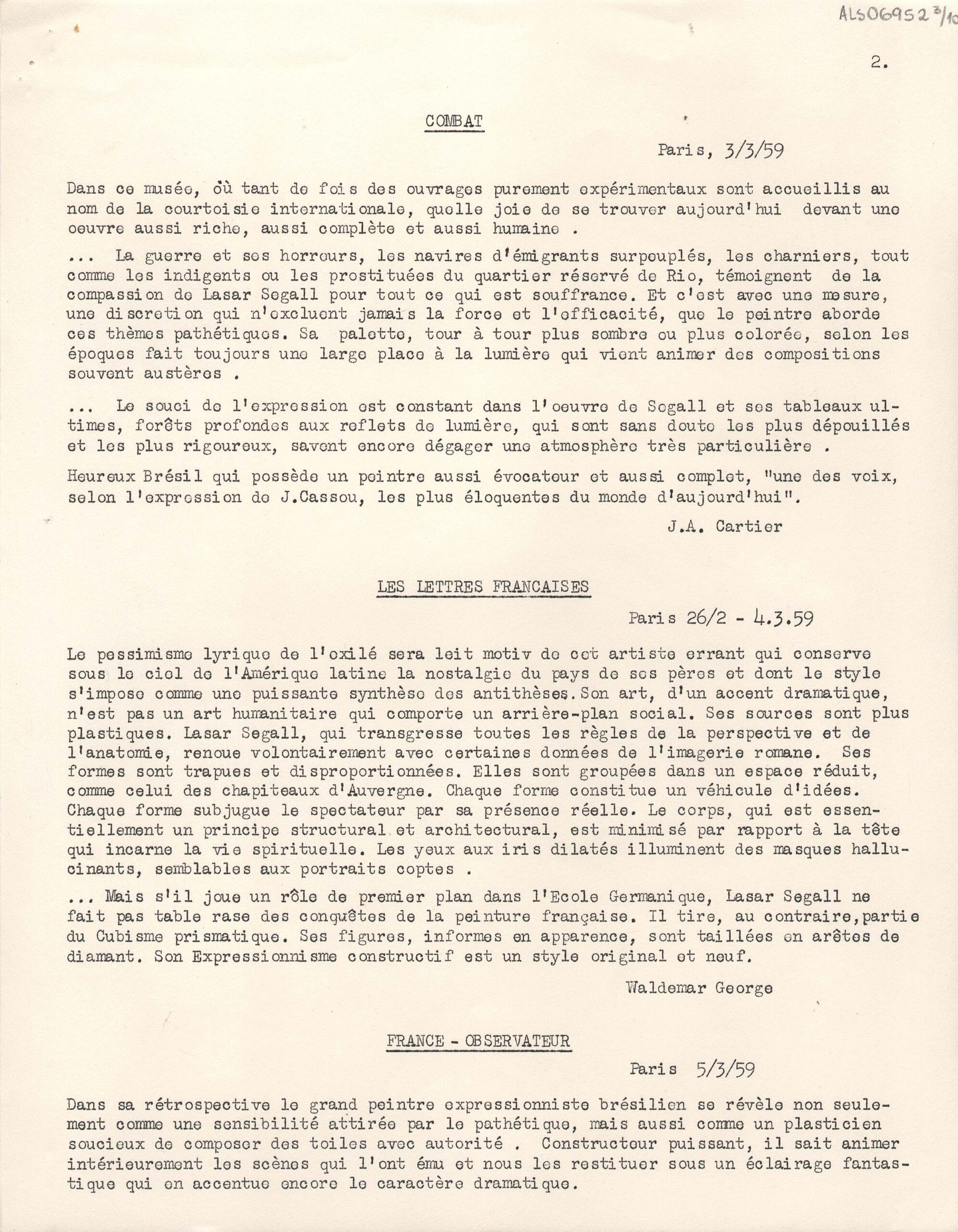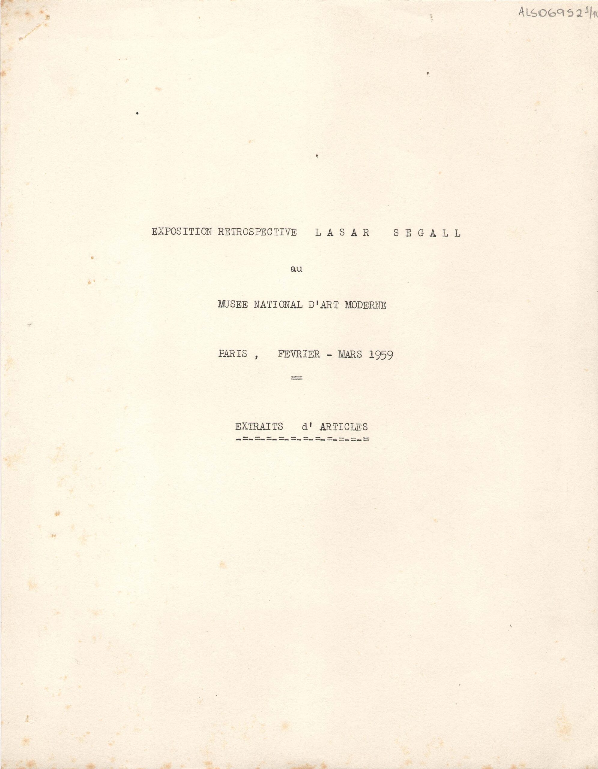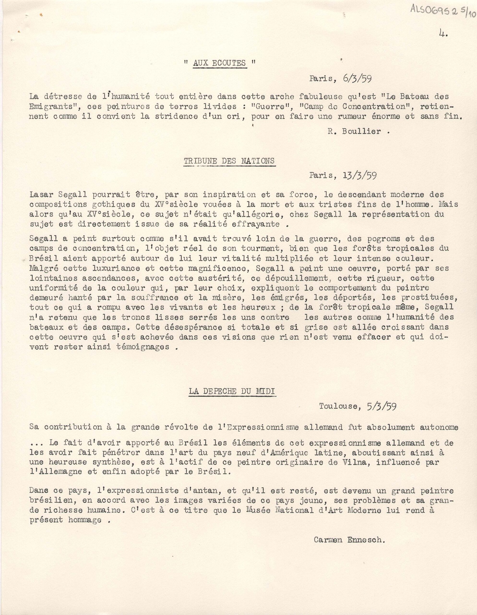 Excertos de textos críticos extraídos de diversas publicações da Europa, a respeito da exposição retrospectiva póstuma de Lasar Segall no Musée National d'Art Moderne Paris