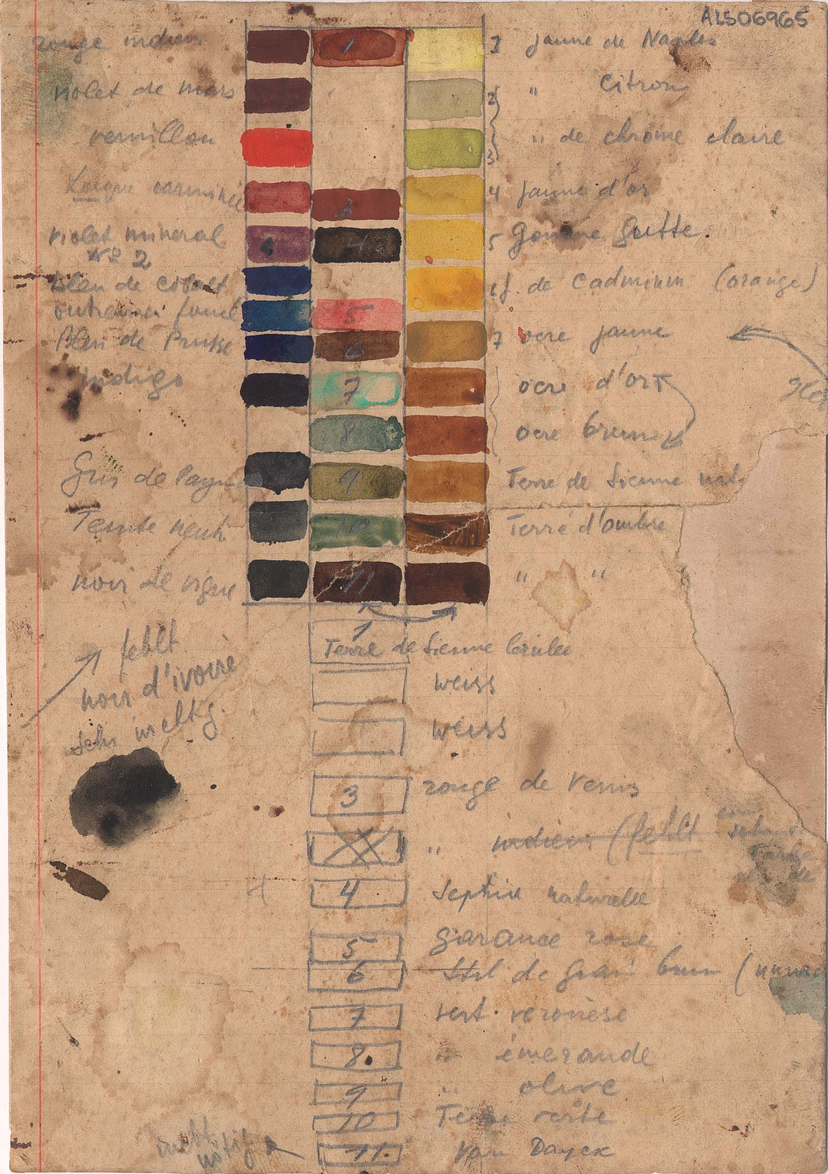 Teste de cartela de cores de tintas aquarela com anotações manuscritas por Lasar Segall