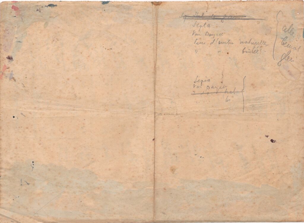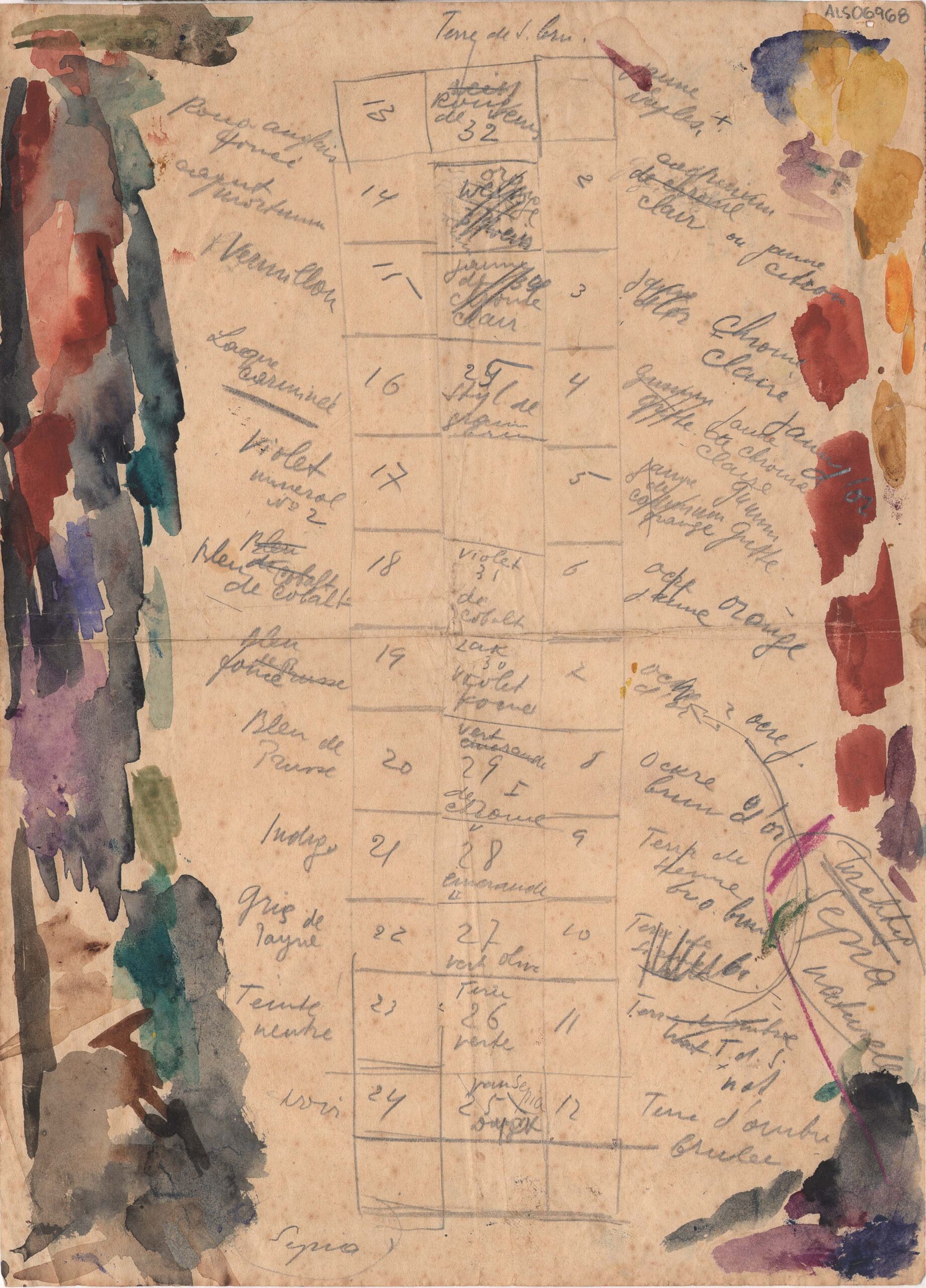 Teste de cartela de cores de tintas aquarela com anotações manuscritas por Lasar Segall