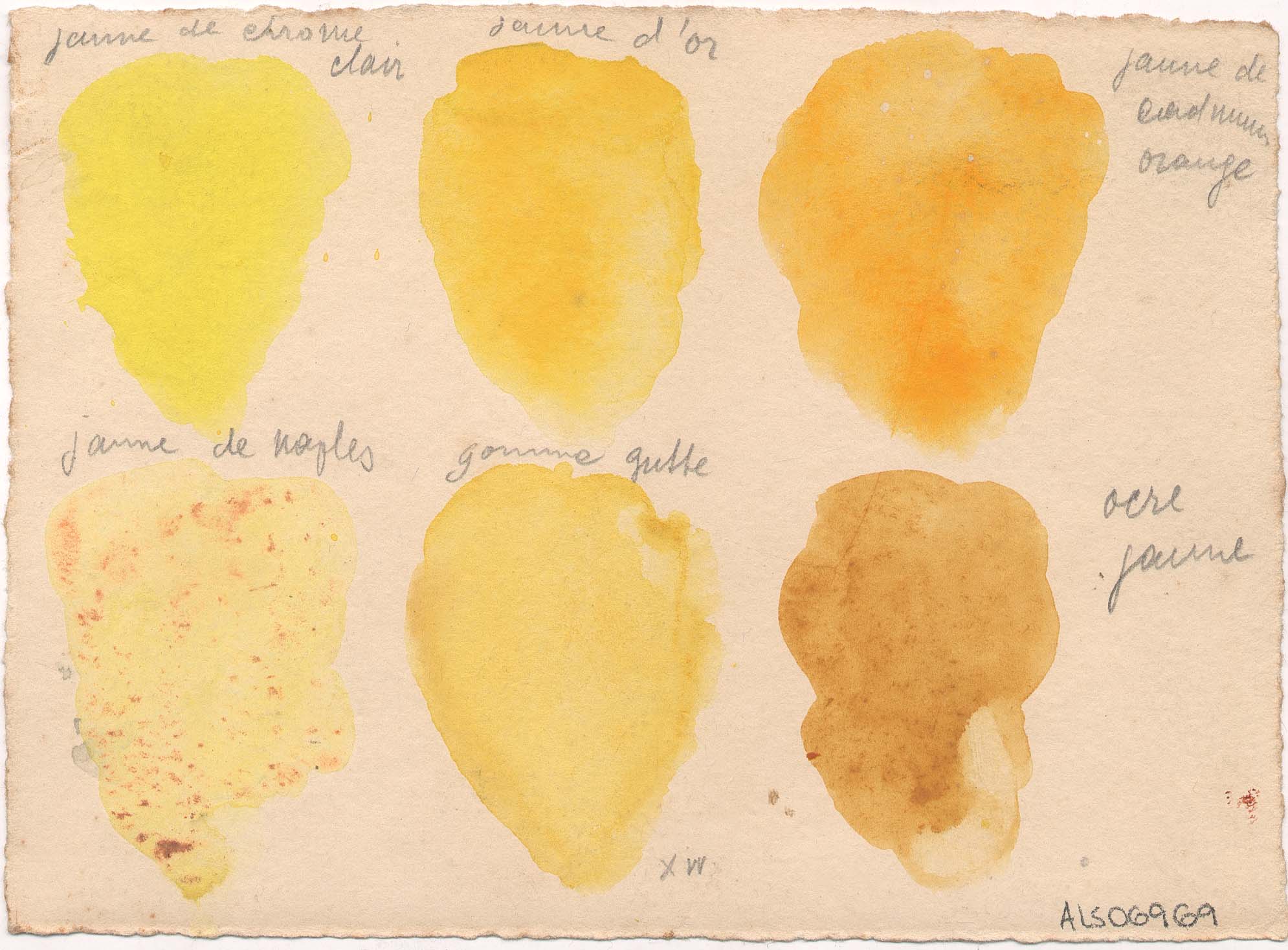 Teste de cartela de cores de tintas aquarela com anotações manuscritas por Lasar Segall