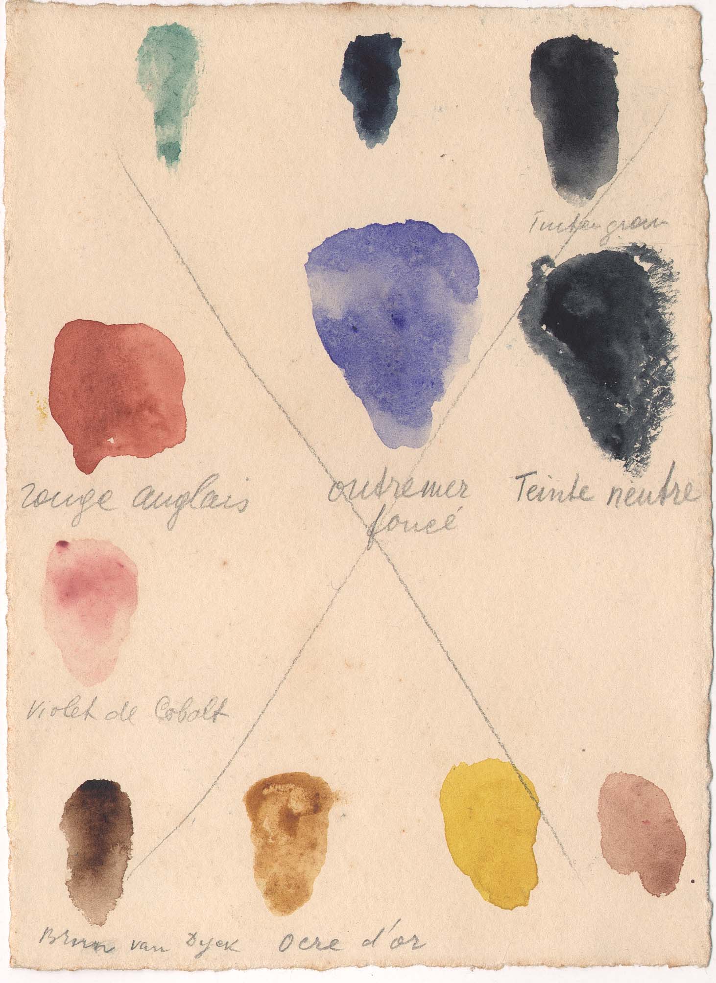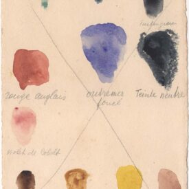 Teste de cartela de cores de tintas aquarela com anotações manuscritas por Lasar Segall
