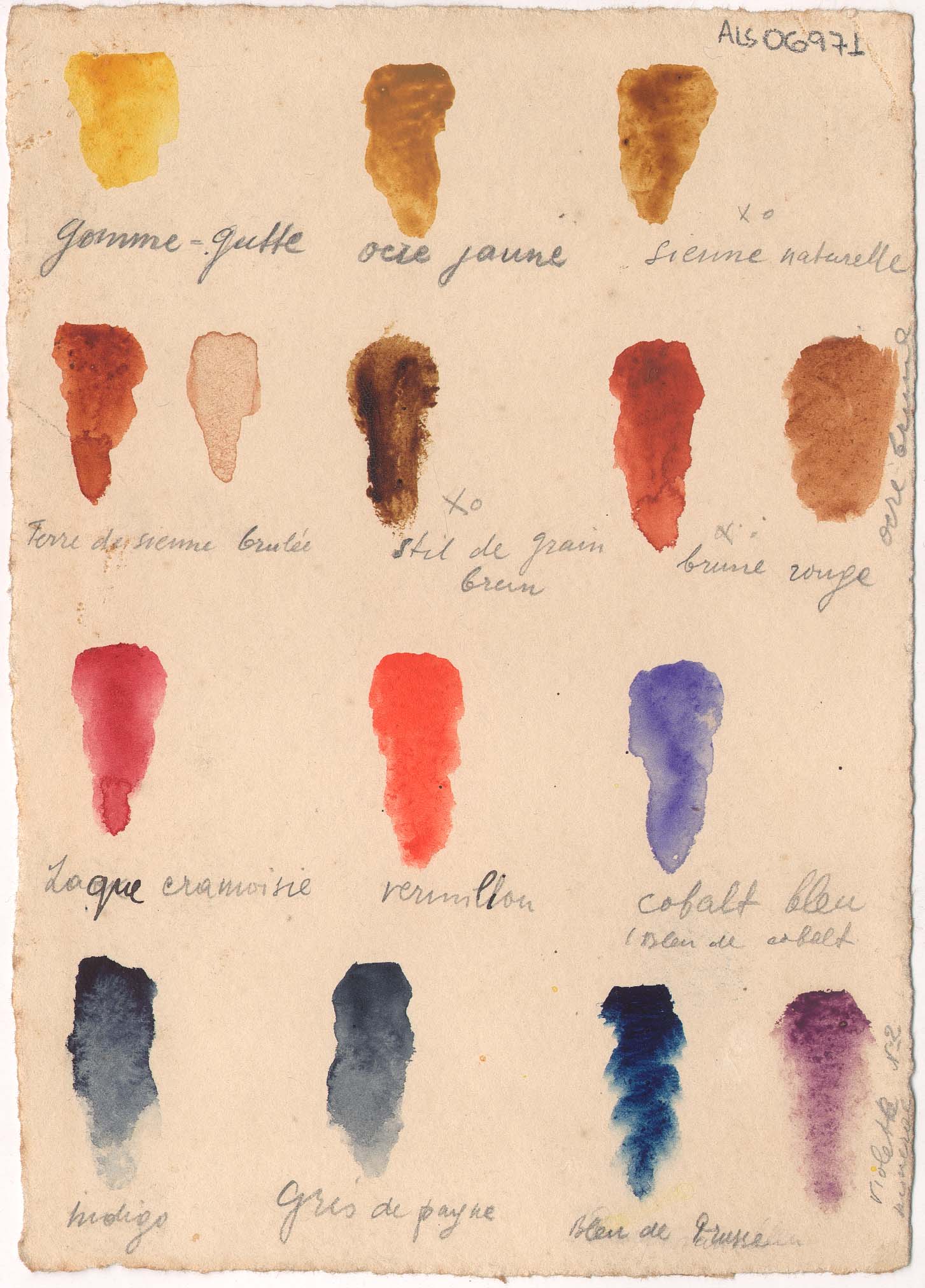 Teste de cartela de cores de tintas aquarela com anotações manuscritas por Lasar Segall