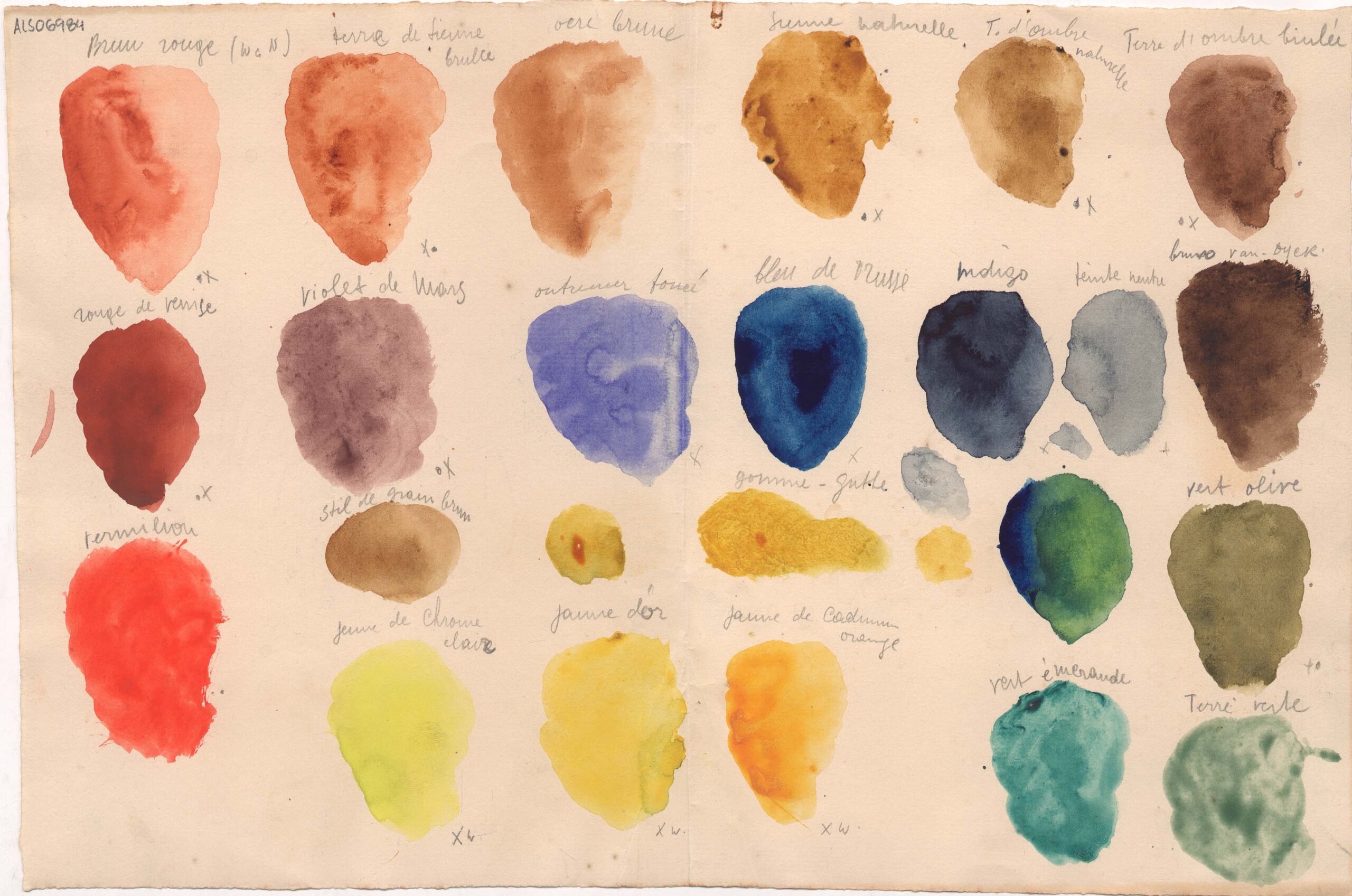 Teste de cartela de cores de tintas para pintura com anotações manuscritas por Lasar Segall