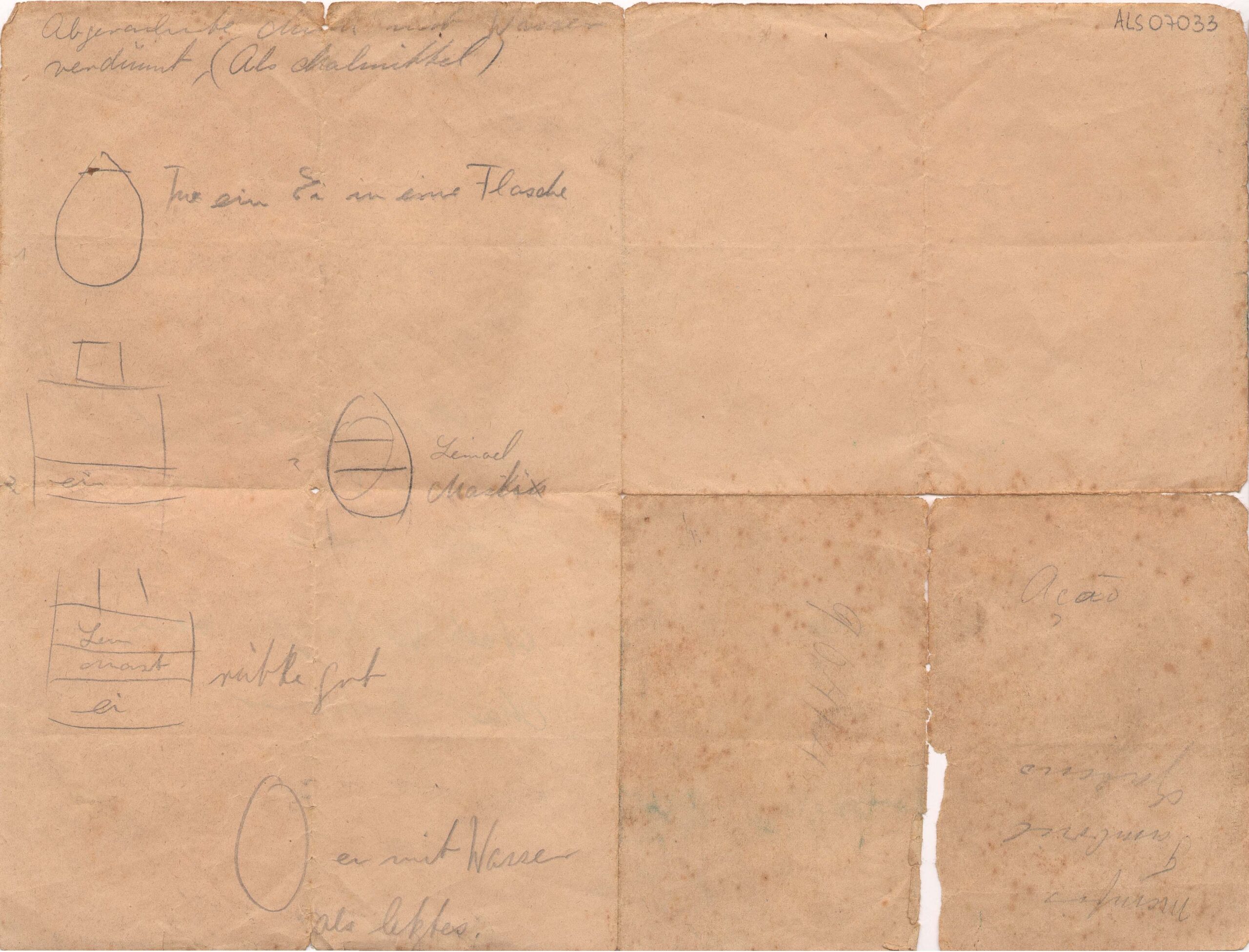 Receita de tinta guache ou têmpera. Notas com desenhos ilustrativos de navios, ovos etc.