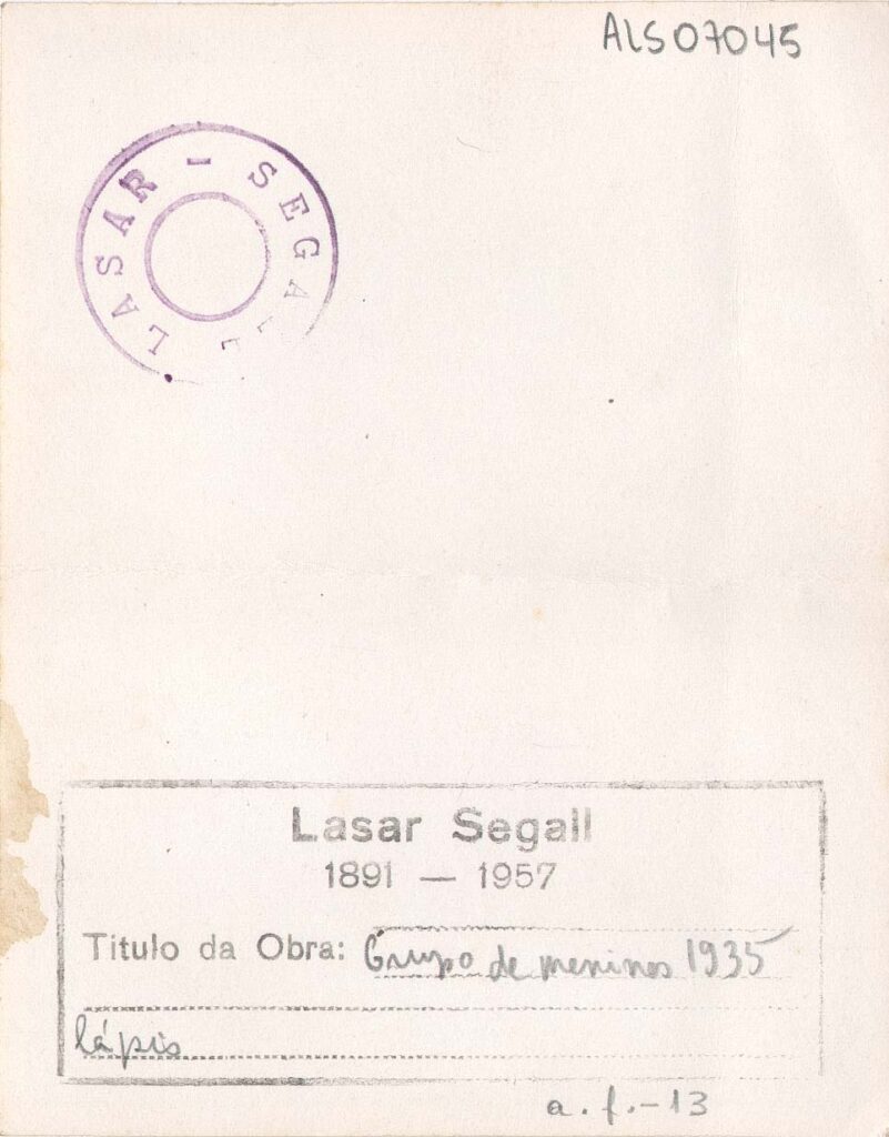 Fotografia em preto e branco; pag.02: carimbo azul: "LASAR SEGALL"; carimbo preto: "Lasar Segall. 1891-1957. Título da Obra:"; anotação manuscrita a grafite: "Grupo de meninos 1935. lápis" [letra JKS]