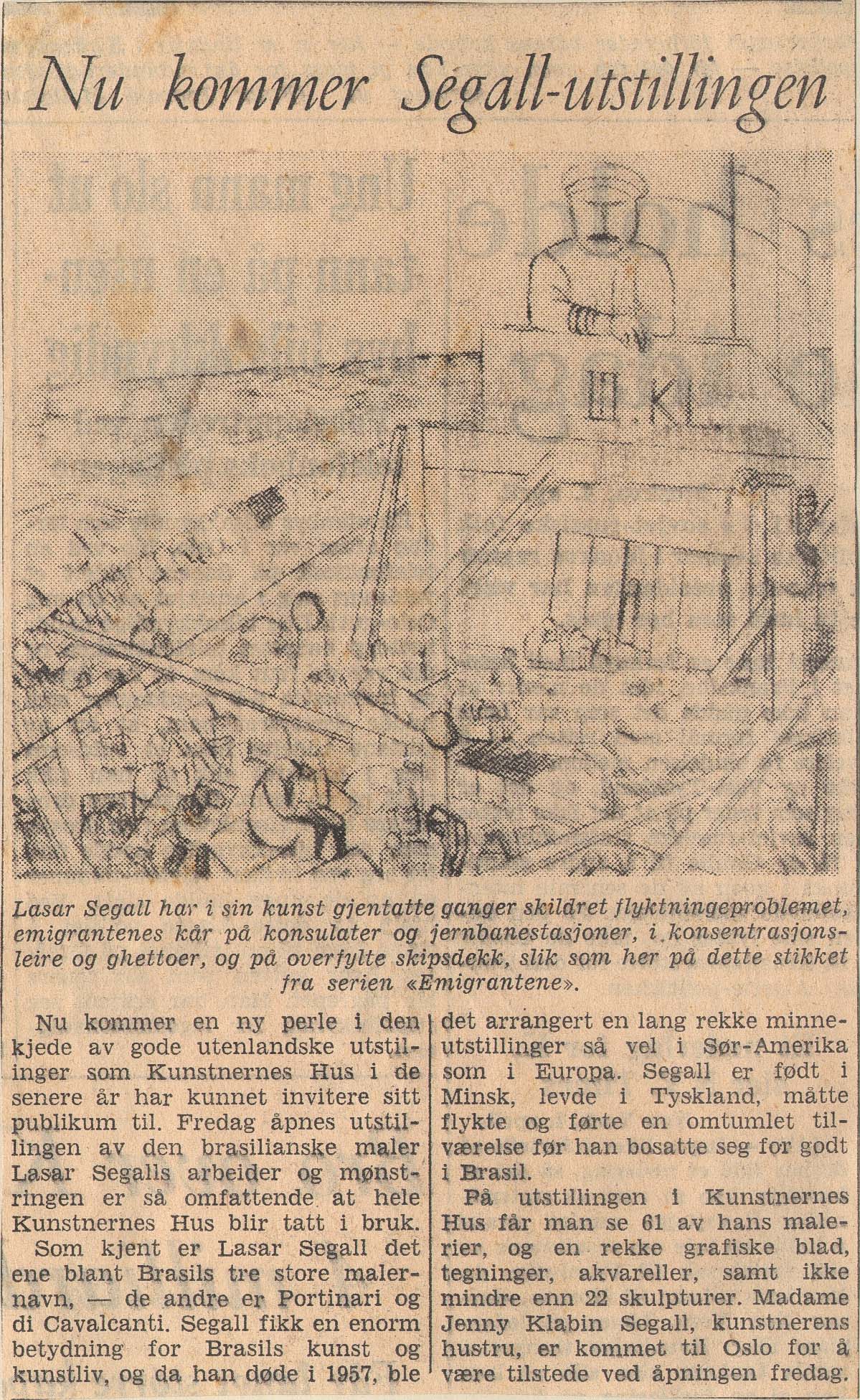 Artigo sobre a inauguração da exposição retrospectiva póstuma de Lasar Segall no Kunstnernes Hus, Oslo