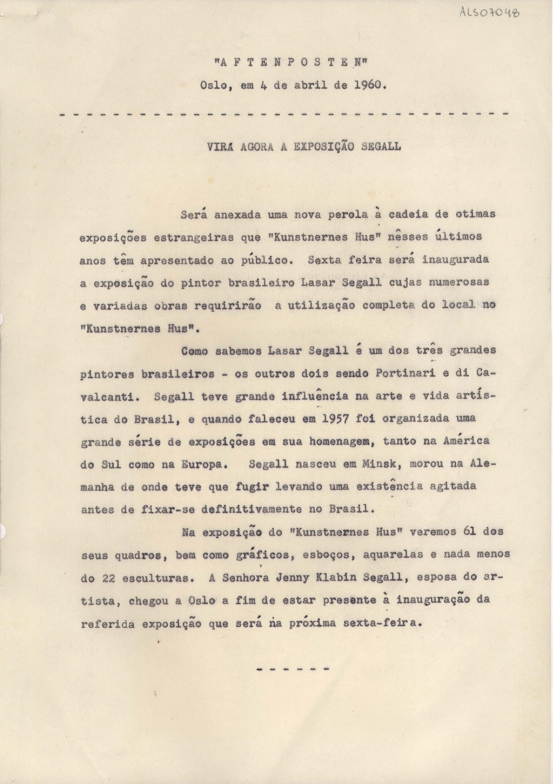 Cópia datilografada de artigo traduzido para o português, originalmente publicado em norueguês no jornal Aftenposten, sobre a inauguração da exposição retrospectiva póstuma de Lasar Segall no Kunstnernes Hus, Oslo