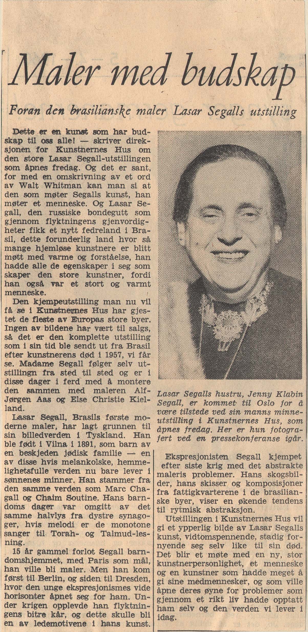 Artigo sobre a exposição retrospectiva póstuma de Lasar Segall no Kunstnernes Hus, Oslo
