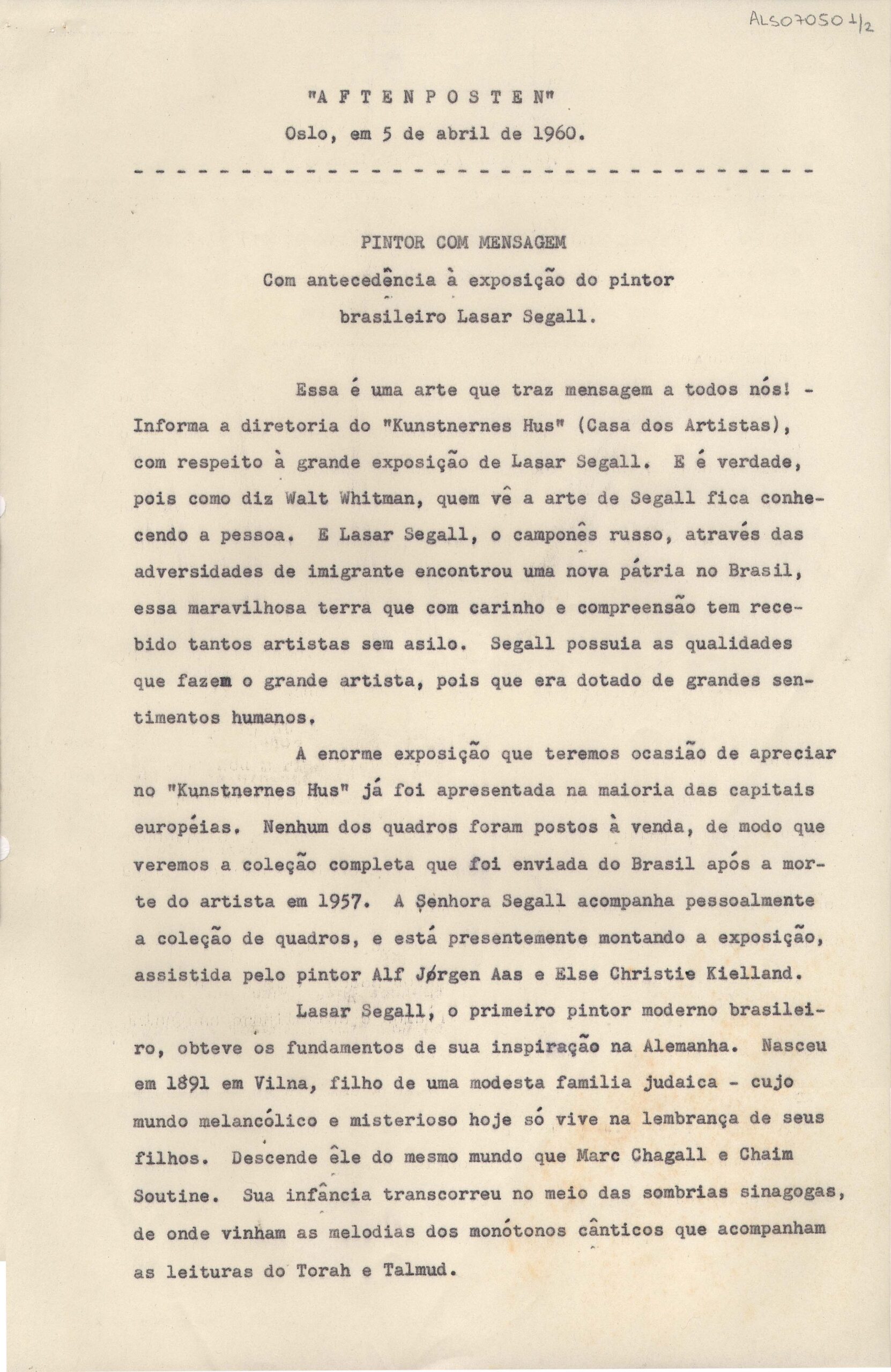 Artigo traduzido para o português, originalmente publicado em norueguês no jornal Aftenposten, sobre a exposição retrospectiva póstuma de Lasar Segall no Kunstnernes Hus, Oslo