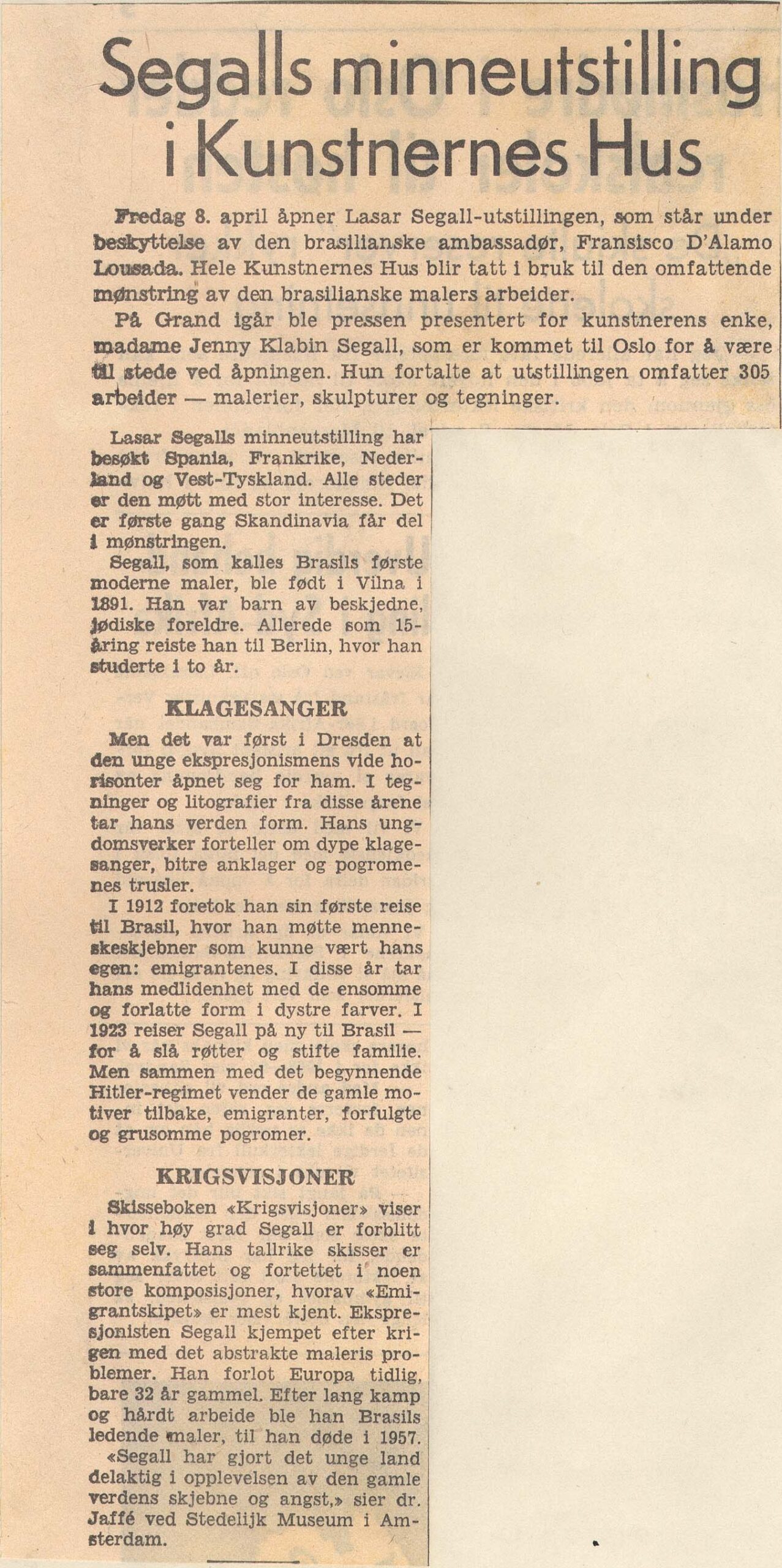 Artigo sobre a inauguração da exposição retrospectiva póstuma de Lasar Segall no Kunstnernes Hus, Oslo. Dados biográficos de Lasar Segall