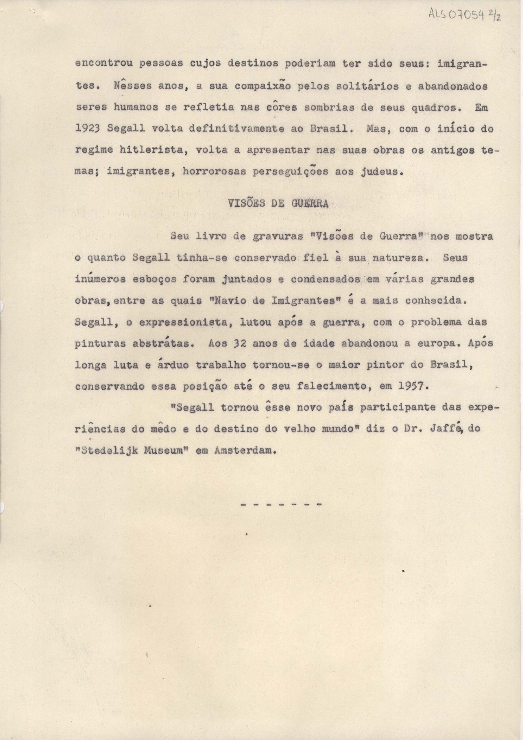 ALS Pasta: Textos - Recortes - de 1920 a 1960 (Releases) (Cópias de textos críticos; provavelmente para imprensa) (biografia; lista de publicações; etc) [letra Vera dHorta]. Envelope interno: Tradução em português e em Francêz de artigos noruegueses. [letra JKS] Envelope da Embaixada dos E. U. do Brasil