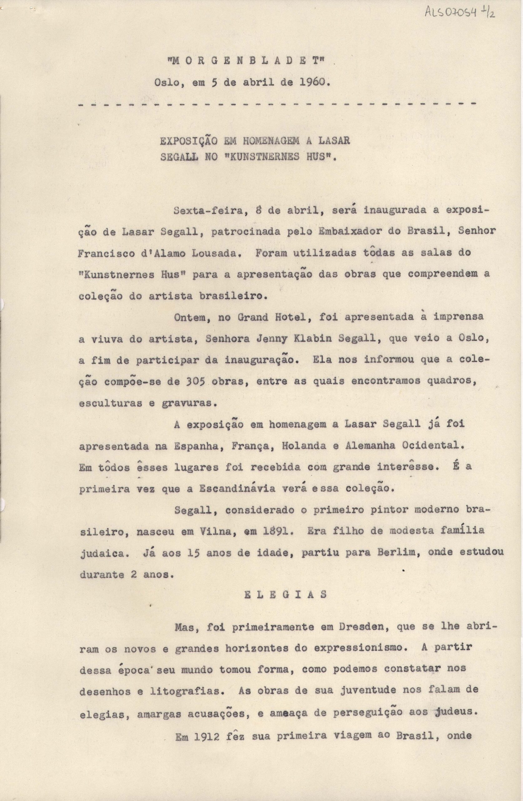 Artigo traduzido para o português, publicado originalmente em norueguês no jornal Morgenbladet, sobre a inauguração da exposição retrospectiva póstuma de Lasar Segall no Kunstnernes Hus, Oslo