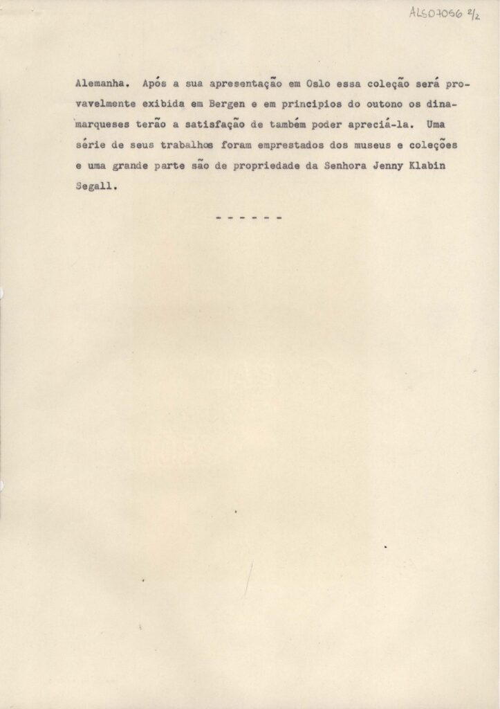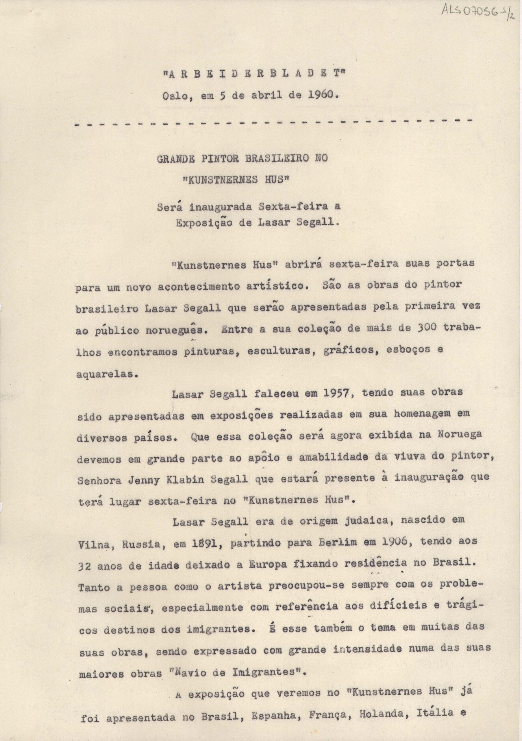 Artigo traduzido para o português, publicado originalmente no jornal Arbeiderbladet, sobre a inauguração da exposição retrospectiva póstuma de Lasar Segall no Kunstnernes Hus, Oslo