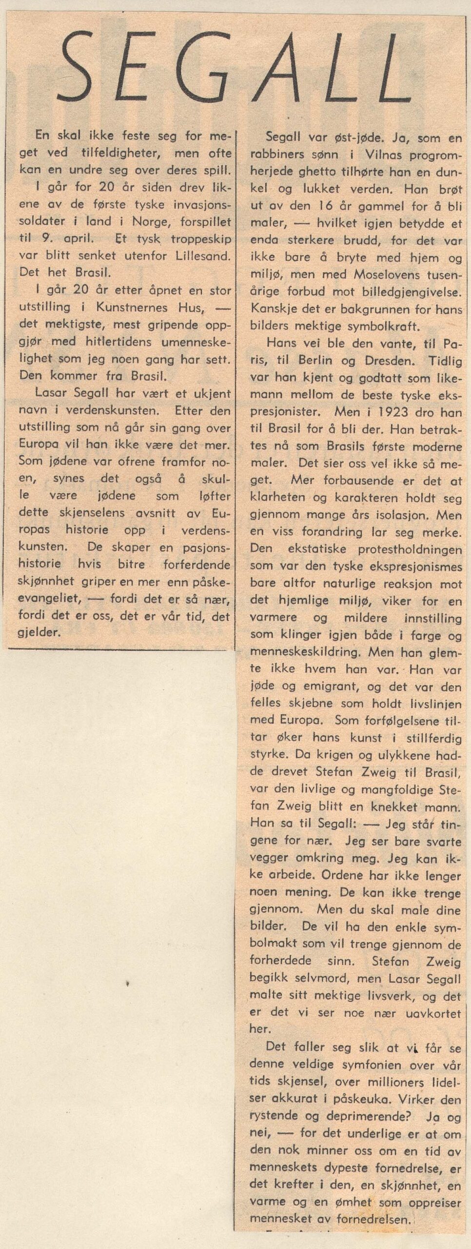 Crítica sobre a exposição retrospectiva póstuma de Lasar Segall no Kunstnernes Hus, Oslo. Segundo o crítico o mais impressionante ajuste de contas com a monstruosidade da era hitlerista