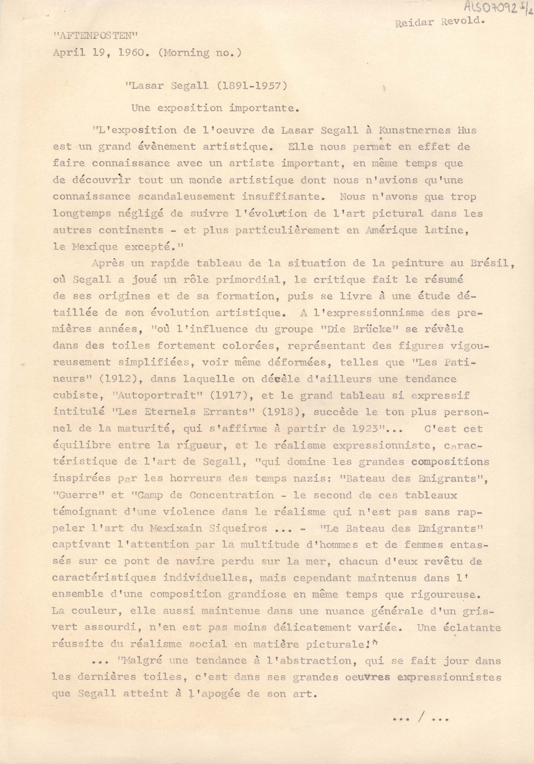 Crítica traduzida para o francês, originalmente publicada em norueguês no jornal Aftenposten, sobre a exposição retrospectiva póstuma de Lasar Segall no Kunstnernes Hus, Oslo. São citadas várias obras