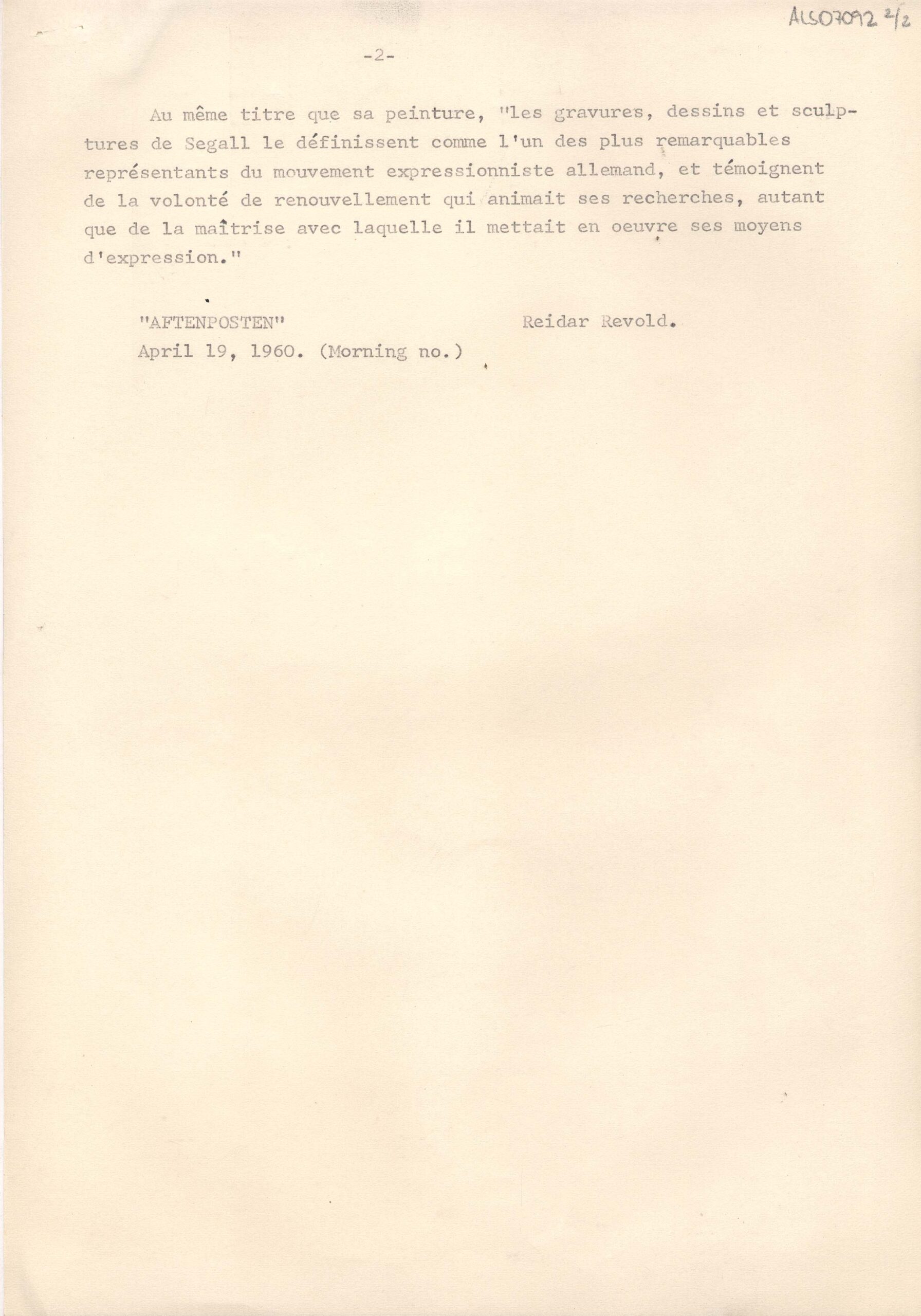 Crítica traduzida para o francês, originalmente publicada em norueguês no jornal Aftenposten, sobre a exposição retrospectiva póstuma de Lasar Segall no Kunstnernes Hus, Oslo. São citadas várias obras