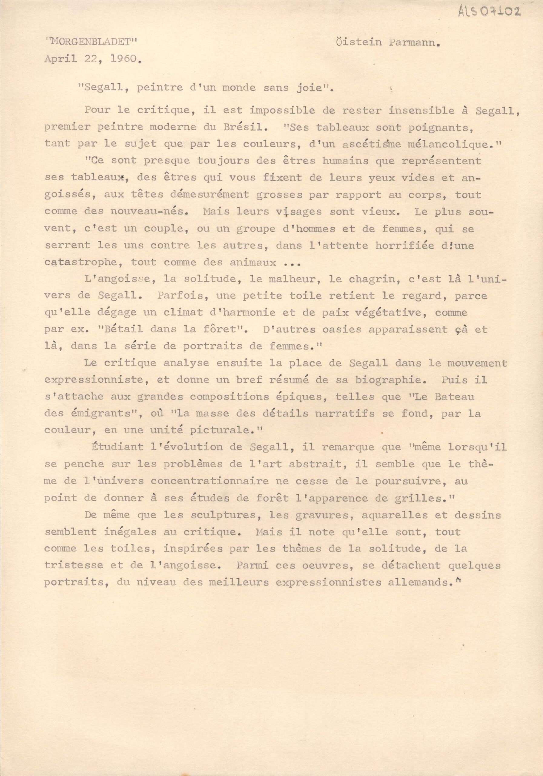 Crítica traduzida para o francês, originalmente publicada em norueguês no jornal Morgenbladet, sobre a exposição retrospectiva póstuma de Lasar Segall no Kunstnernes Hus, Oslo. Menção a seus temas recorrentes e a algumas de suas obras