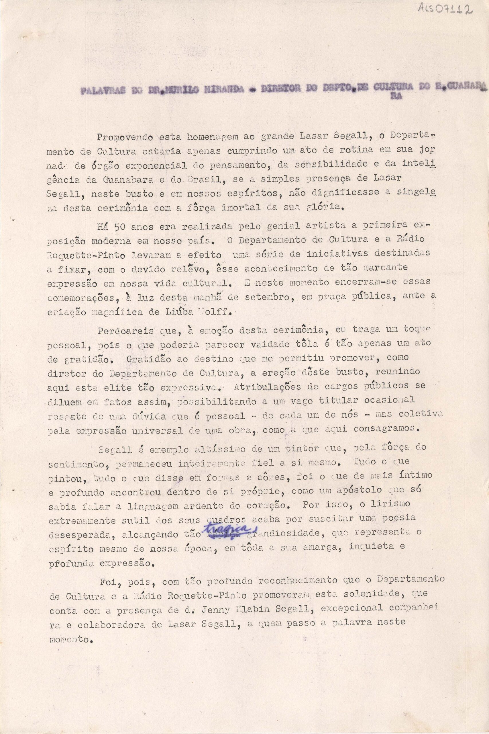 Transcrição do discurso pronunciado por Murilo Miranda, na inauguração do busto de Lasar Segall