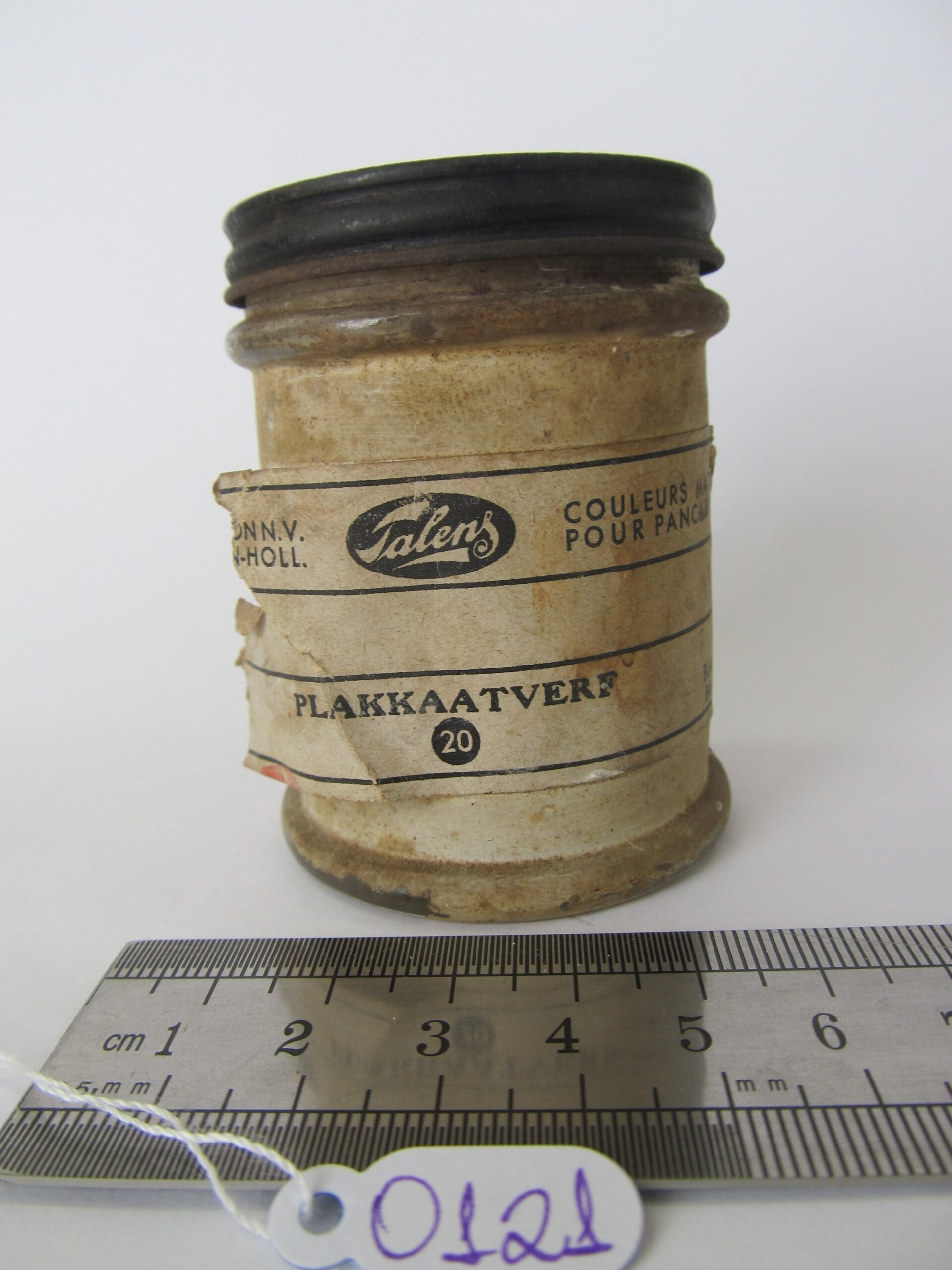 IT0121administrator12 de maio de 2025 Home Acervo Documental IT0121 2016112316565228_0_ITEM_OR-1_20806_1 Baixar DescriçãoVidro de tinta Talens branco com uma camada fina colada em torno do vidro. Etiqueta colada e rasgada com perda de suporte com as inscrições: "Mídiahttps://lasar-segall-2.s3.amazonaws.com/2016112316565228_0_ITEM_OR-1_20806_1Nome do arquivoIT0121.jpgPrincipalTrueDimensões TipoAltura Valor7 | TipoLargura Valor5 | TipoProfundidade Observações geraisMATERIAIS: Vidro e metal; OBSERVAÇÕES: Tampa de metal de rosca. Rótulo de papel 048; DATA FOTOGRAFIA: 2012-12-17Localização atualVitrine Antesala De Exposição - Ateliê Segall - PrateleiraNívelInstrumentos de trabalhoTítulo/ denominaçãoVidro de tinta Talens brancoData atribuída?falseInscrições inscriçãoTALENS"."COULEURS MATES POUR PANCARTES". "BLANC". "PLAKKAATVERF" - 20 Histórico Tipo de históricoNúmero anterior Descrição do histórico181 Item anteriorIT0120 Próximo itemIT0122