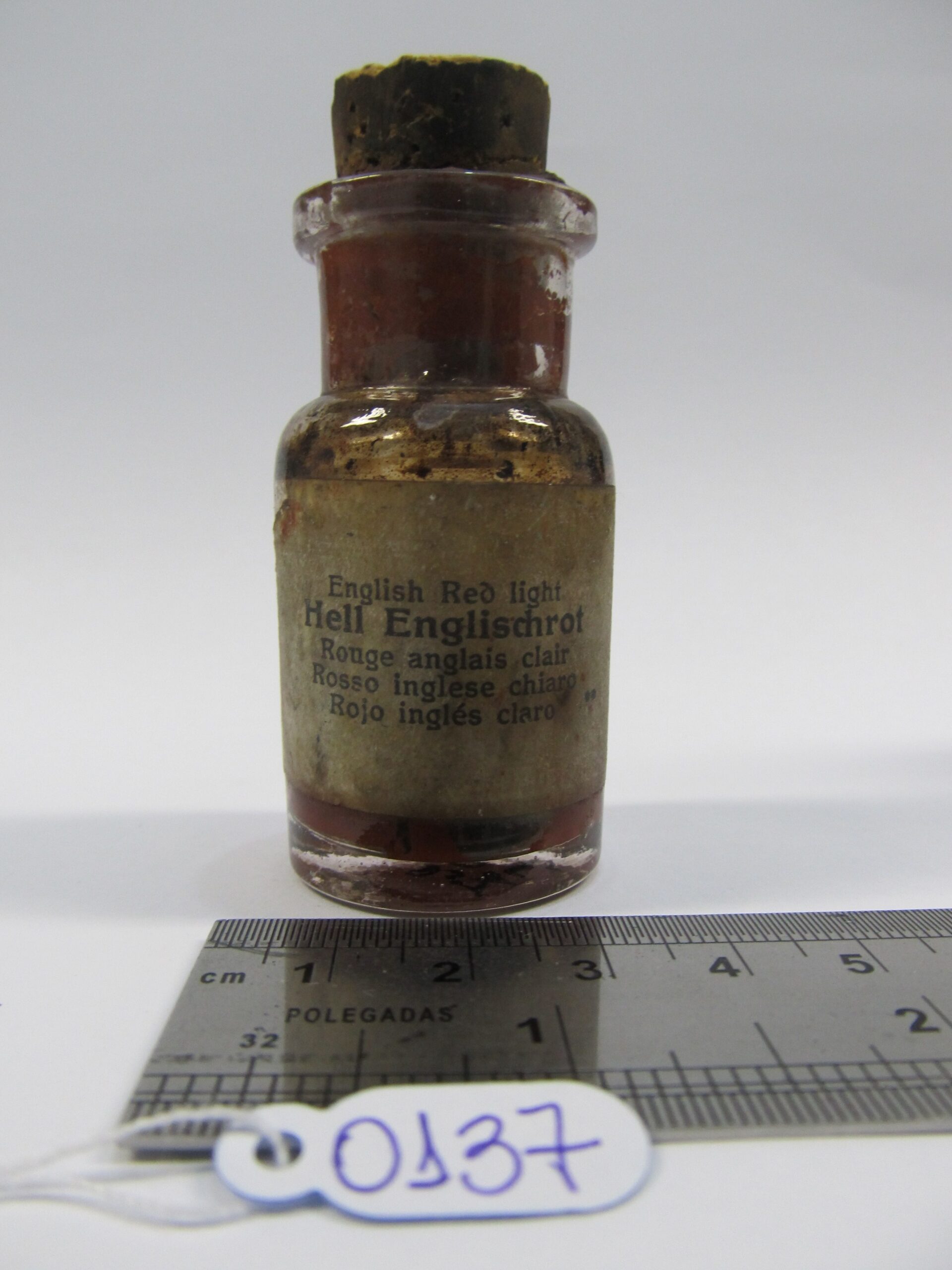 IT0137administrator12 de maio de 2025 Home Acervo Documental IT0137 20161124141913425_0_ITEM_OR-1_20770_1 Baixar Mídiahttps://lasar-segall-2.s3.amazonaws.com/20161124141913425_0_ITEM_OR-1_20770_1Nome do arquivoIT0137.jpgPrincipalTrueDimensões TipoAltura Valor7 | TipoLargura Valor3 | TipoProfundidade Observações geraisMATERIAIS: Vidro e cortiça; OBSERVAÇÕES: Material endurecido.Tampa de rolha; DATA FOTOGRAFIA: 2012-12-17Localização atualVitrine Antesala De Exposição - Ateliê Segall - PrateleiraNívelInstrumentos de trabalhoTítulo/ denominaçãoVidro de tinta cor tijoloData atribuída?falseInscrições inscrição2 rótulos de papel; um sem inscrições; outro "English red light" " Hell Englischrot Rouge Anglais Clair Histórico Tipo de históricoNúmero anterior Descrição do histórico201 Item anteriorIT0136 Próximo itemIT0138