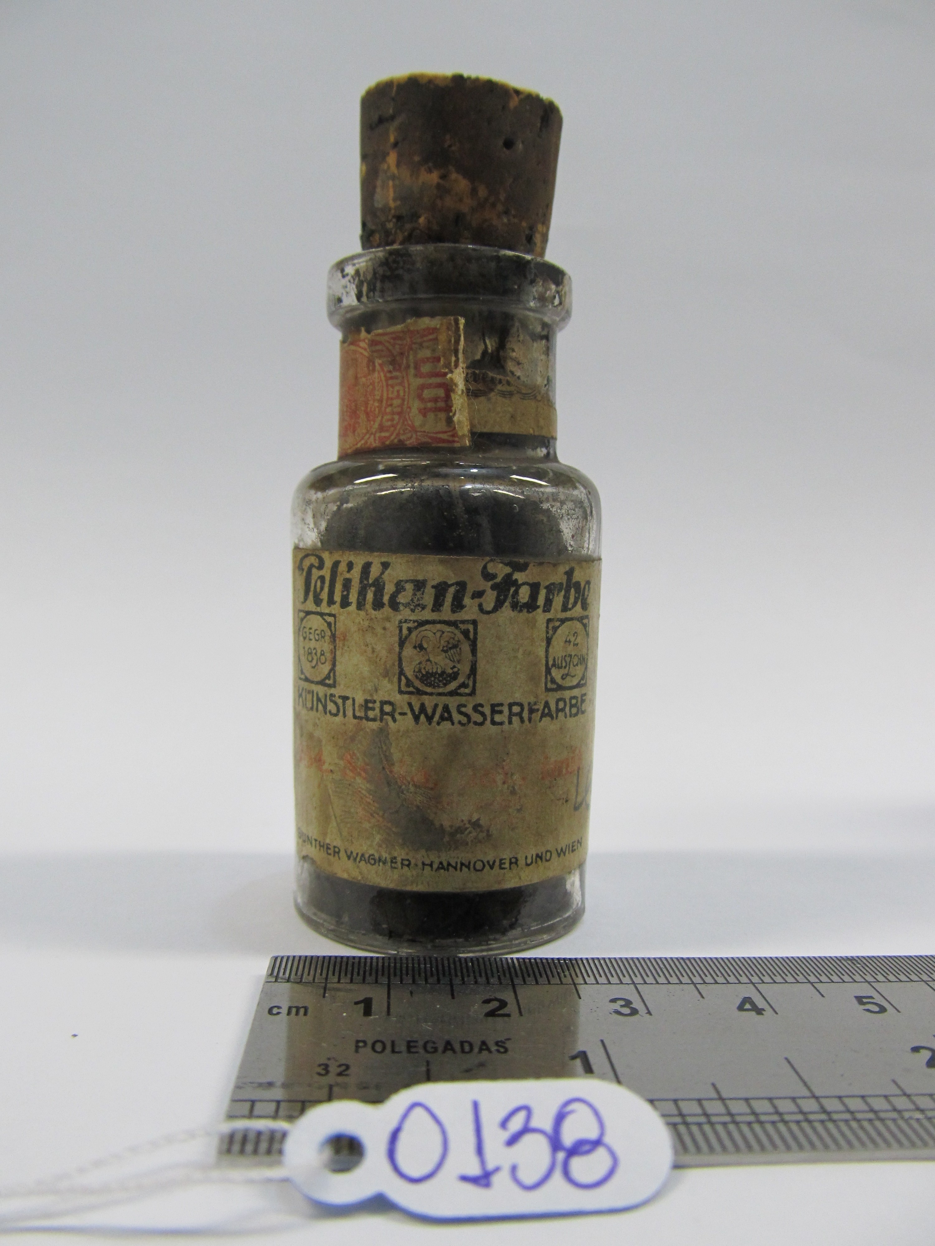 IT0138administrator12 de maio de 2025 Home Acervo Documental IT0138 20161124142435652_0_ITEM_OR-1_20768_1 Baixar DescriçãoTampa de rolhaMídiahttps://lasar-segall-2.s3.amazonaws.com/20161124142435652_0_ITEM_OR-1_20768_1Nome do arquivoIT0138.jpgPrincipalTrueDimensões TipoAltura Valor8 | TipoLargura Valor2.8 | TipoProfundidade Observações geraisMATERIAIS: Vidro e cortiça; OBSERVAÇÕES: Selo em volta da gargalho; DATA FOTOGRAFIA: 2012-12-17Localização atualVitrine Antesala De Exposição - Ateliê Segall - PrateleiraNívelInstrumentos de trabalhoTítulo/ denominaçãoVidro de tinta Pelikan sépiaData atribuída?falseInscrições inscriçãoRótulo de papel: " Pelikan Farbe 184 GUNTHER WAGNER HANNOVER UMD WIEN - KUNSTLER - WASSERFARB" Histórico Tipo de históricoNúmero anterior Descrição do histórico202 Item anteriorIT0137 Próximo itemIT0139