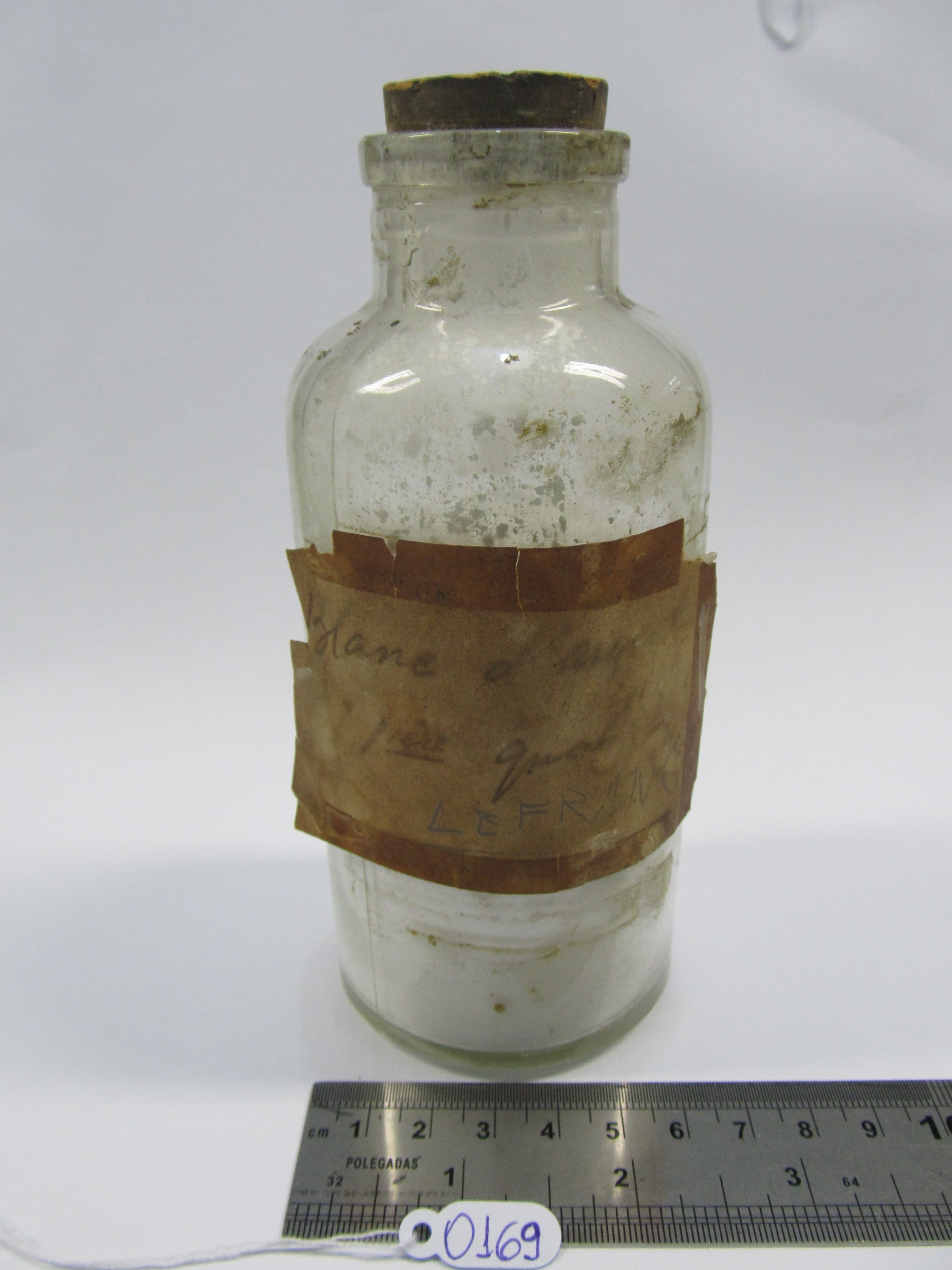IT0169administrator12 de maio de 2025 Home Acervo Documental IT0169 20170418172559791_0_ITEM_OR-1_20799_1 Baixar Mídiahttps://lasar-segall-2.s3.amazonaws.com/20170418172559791_0_ITEM_OR-1_20799_1Nome do arquivoIT0169.jpgPrincipalTrueDimensões TipoAltura Valor15 | TipoLargura Valor6 | TipoProfundidade Observações geraisMATERIAIS: Vidro e cortiça; OBSERVAÇÕES: Tampa de rolha necessita ser colado. Tampa danificada; DATA FOTOGRAFIA: 2012-12-17Localização atualVitrine Antesala De Exposição - Ateliê Segall - PrateleiraNívelInstrumentos de trabalhoTítulo/ denominaçãoVidro de pigmento brancoData atribuída?falseInscrições inscriçãoRótulo manuscrito com marcas de durex "Blanc d´linger fere qual". "Le Franc". Etiqueta na base com inscrição " 246" Histórico Tipo de históricoNúmero anterior Descrição do histórico246 Item anteriorIT0168 Próximo itemIT0170