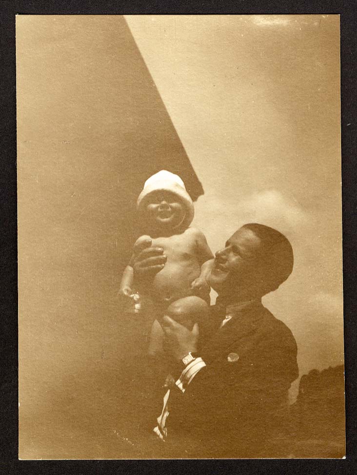 ASSUNTO : Lasar Segall | família / OBSERVAÇÕES GERAIS(v309) : legenda para publicação-exposição: | Segall com seu filho Mauricio; c. 1926 | Fotógrafo não identificado | Cópia em papel; emulsão de gelatina e sais de prata com viragem sépia. | 7;7 x 5;6 cm / OBSERVAÇÃO DATA(duvida/cerca/dedicatória) : cerca