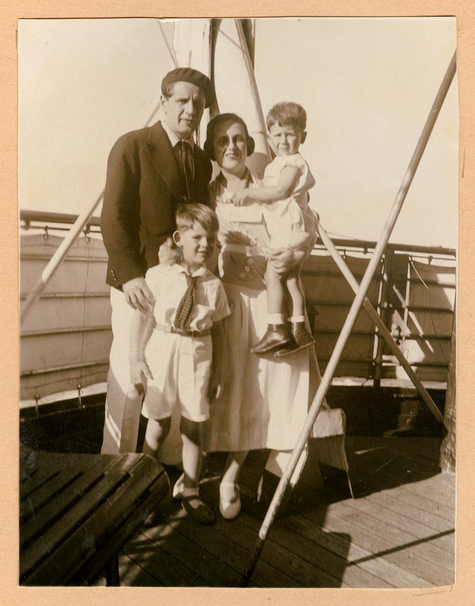 OBSERVAÇÃO GERAIS DO TOMBO(v110) : albIIIpg46 / ASSUNTO : Família Segall - A bordo do Cap.Arcona / OBSERVAÇÕES GERAIS(v309) : informação obtida no Album Família III; pg 46; por Jenny Klabin Segall | Legenda exposição-publicação: | Segall e Jenny com os filhos Mauricio e Oscar; em viagem de retorno ao Brasil; a bordo do navio Cap. Arcona; abril de 1932 | Fotógrafo não identificado | Cópia em papel; emulsão de gelatina e sais de prata com viragem sépia | 10 cm × 7;6 cm