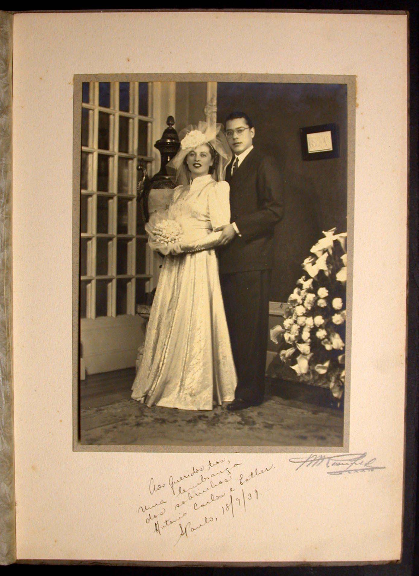 Inscrição--Imagem--M.i--Aos queridos tios uma lembrança dos sobrinhos Antonio Carlos e Esther S.Paulo; 18-9-39 -- assinatura do fotógrafo à lápis no canto--Carimbo--Imagem--Ct--Retrato por Max Rosenfeld Libero Badaró; 282 Tel. 2-5716 São Paulo Edifício Odeon 12o andar Rio de Janeiro--Na capa do suporte