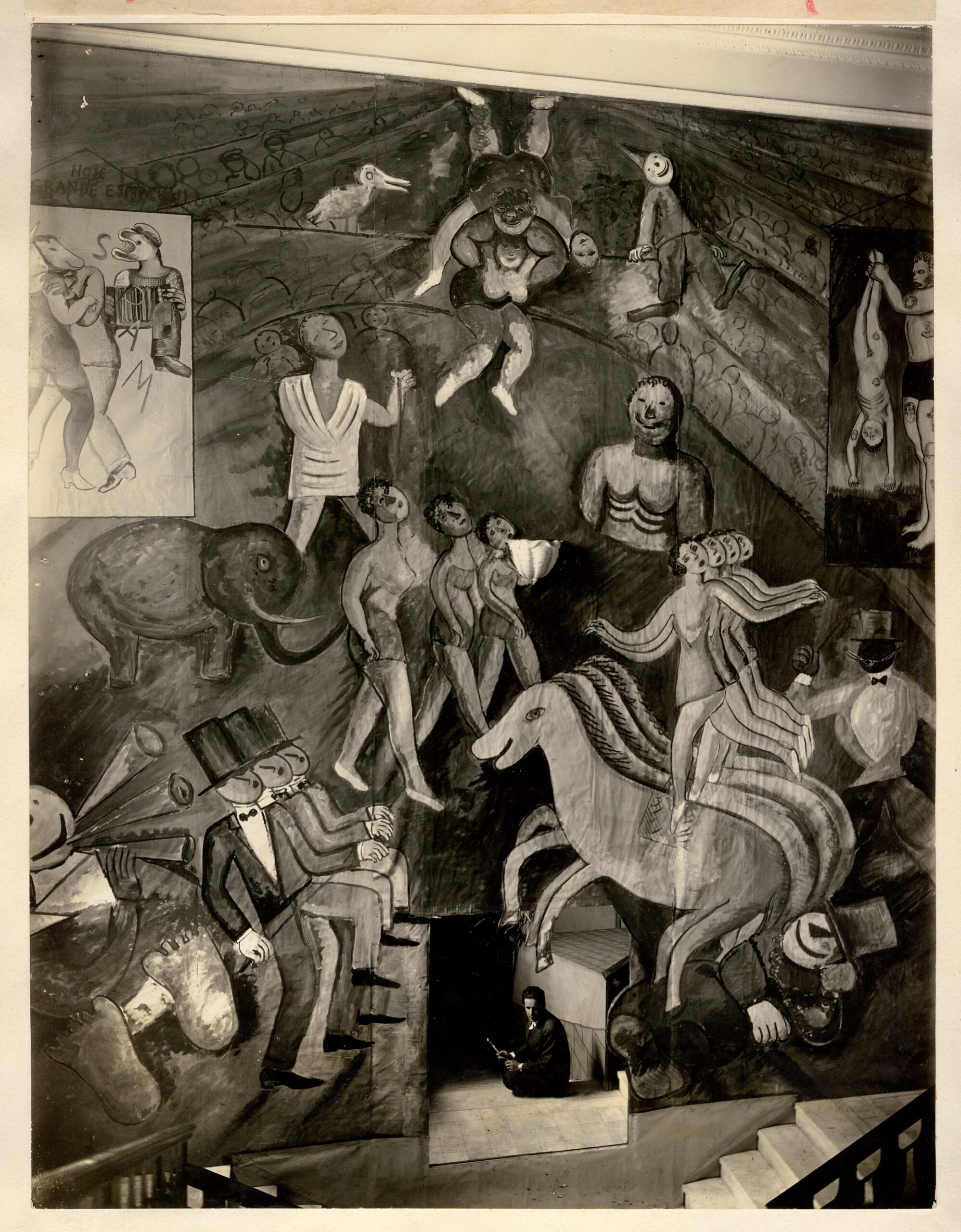 Painel O Circo; de autoria de Lasar Segall; ao fundo espelho refletindo o artista.