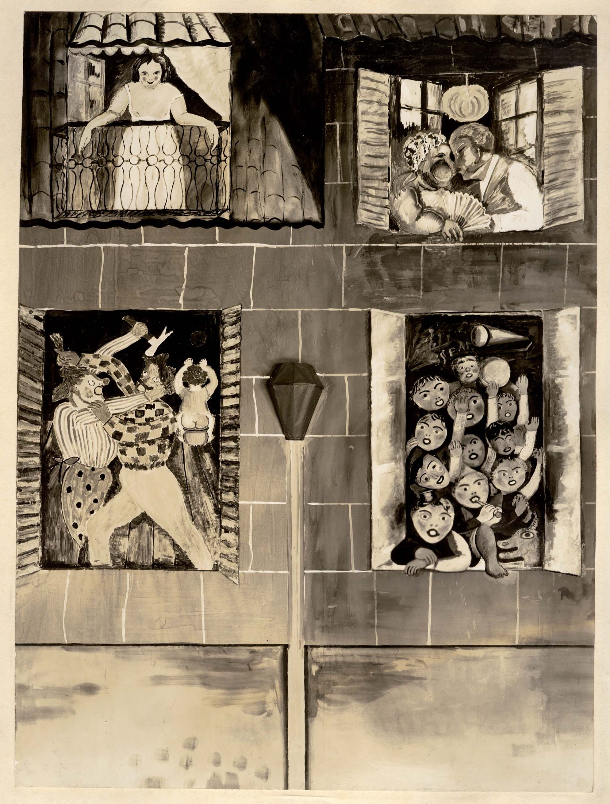 Á esquerda; no alto; o painel "Mulher no balcão"; de autoria de Vittorio Gobbis; embaixo; painel "Briga de família"; de autoria de Jenny Klabin Segall. À direita; no alto; o painel "Casal se beijando"; de autoria provavel de Vittorio Gobbis; embaixo; o painel "Crianças com máscaras"; de autoria de Lasar Segall