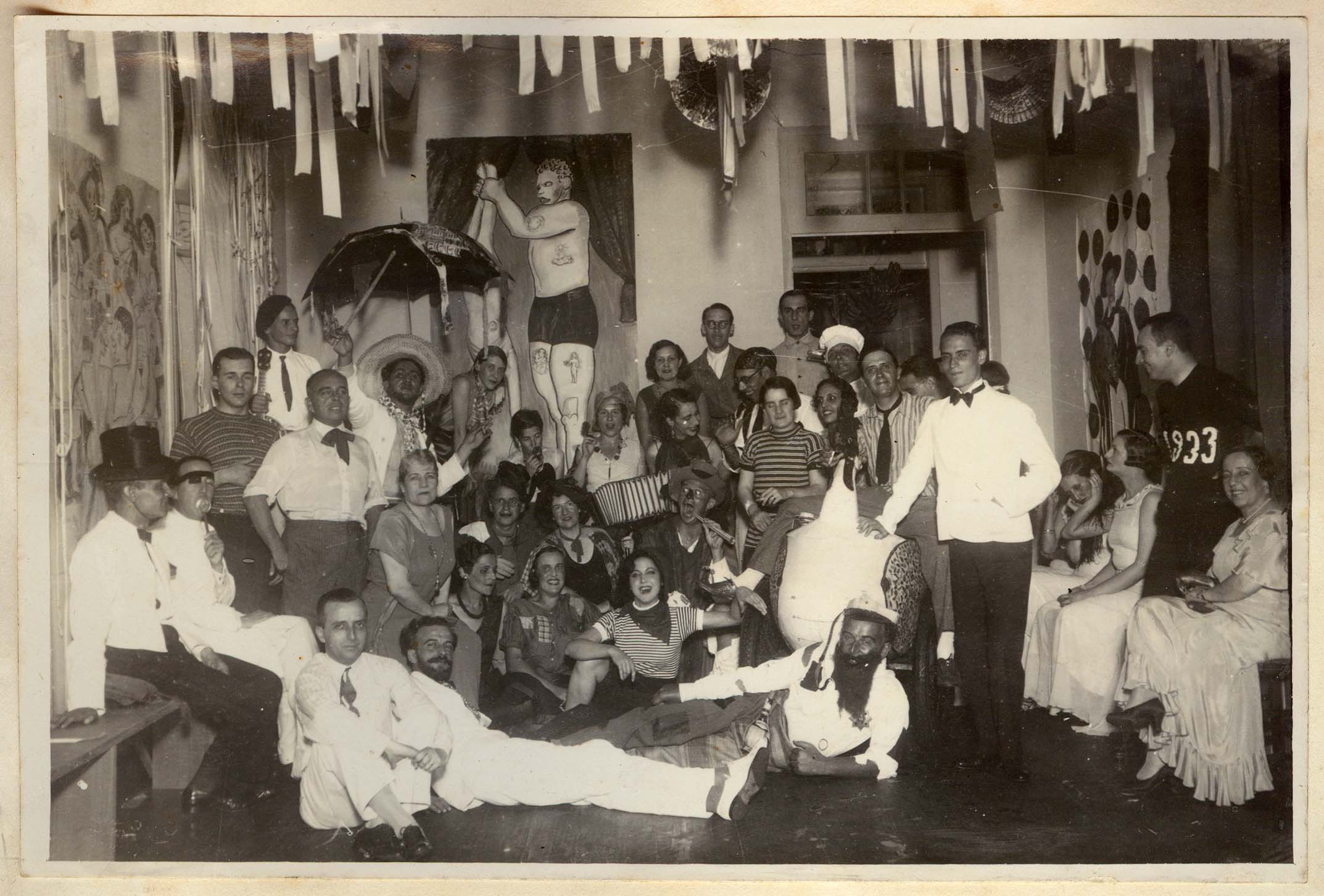 Aspecto do Baile São Silvestre em Farrapos na casa de Chinita Ulmann; 31/12/1932. Ao fundo painel "O gigante e a criança" de autoria de Lasar Segall; na parede esquerda painel "Bebedores de vinho"; de Jenny Klabin Segall.