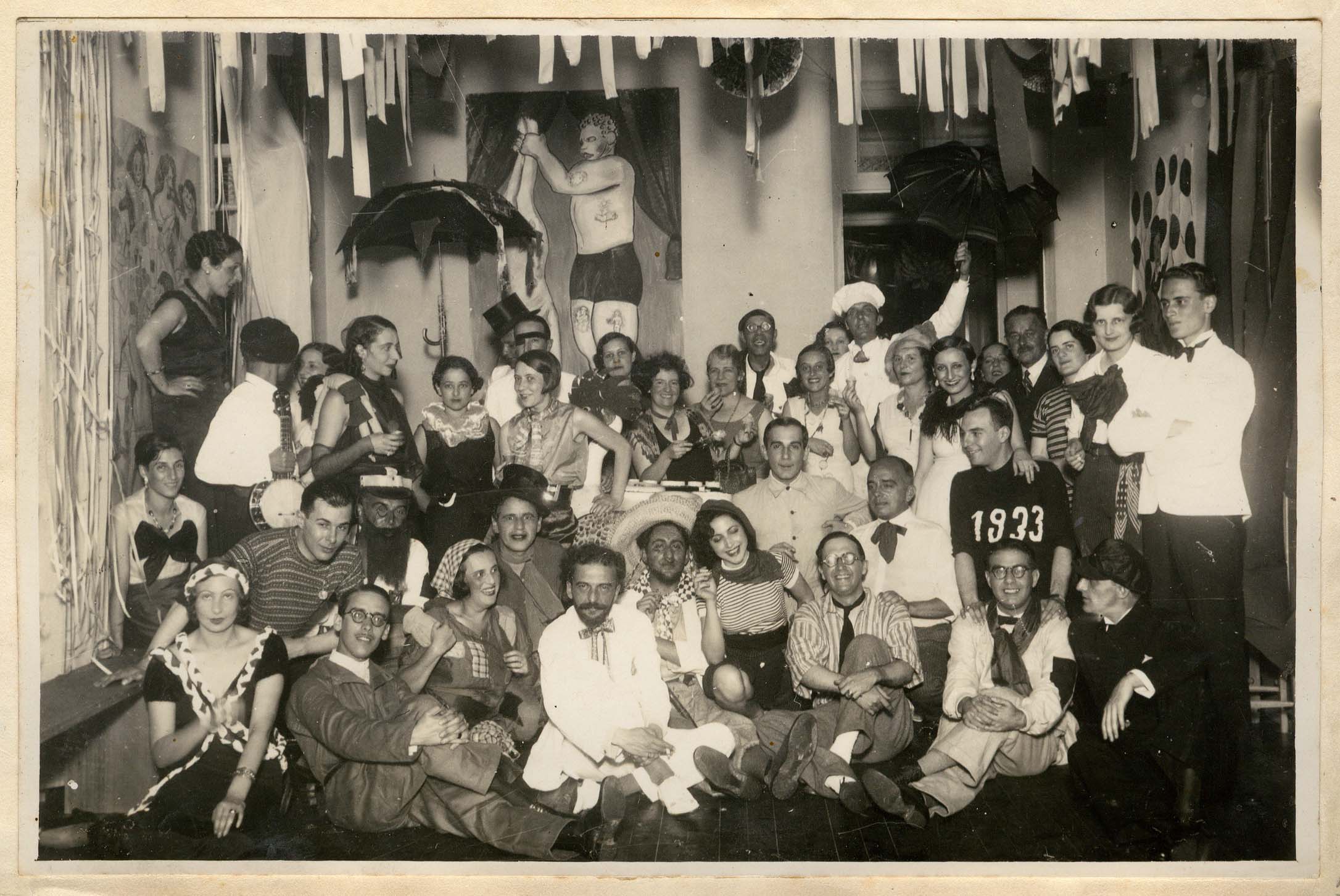 Aspecto do Baile São Silvestre em Farrapos; comemorando a criação da SPAM; na casa de Chinita Ulmann; 31/12/1932. Ao fundo painel "O gigante e a criança" de autoria de Lasar Segall.