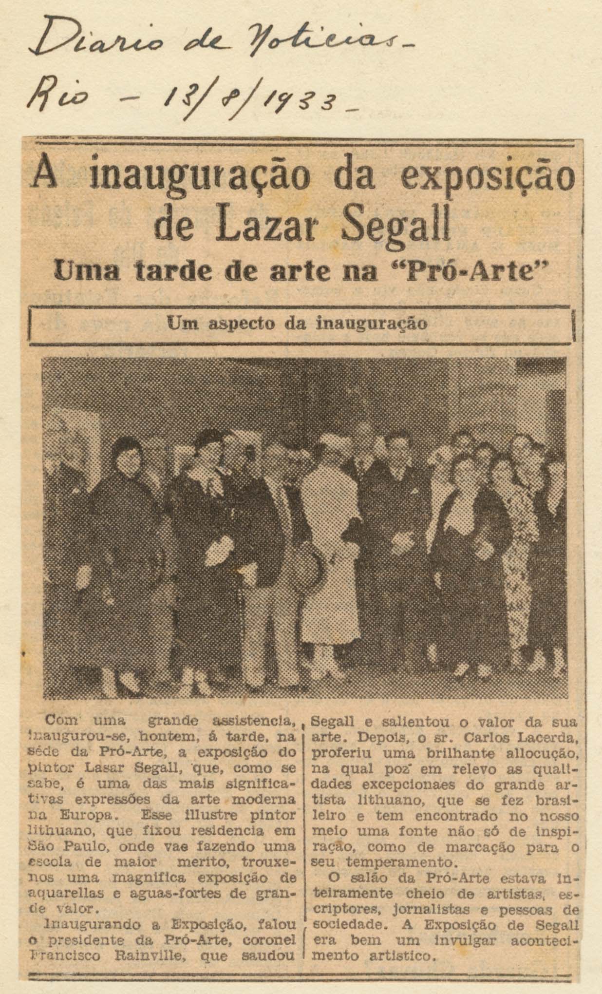 OBSERVAÇÃO GERAIS DO TOMBO(v110) : Álbum Recortes de Imprensa Brasileira I; pg104 / ASSUNTO : Lasar Segall-Exposição Pró Arte